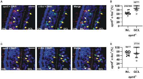 Figure 6. The majority of opn5+ and opn8+ cells were activated in response to light. (A,C) Double FISH against opn5 (red) and c-fos (green) (A) and opn8 (red) and c-fos (green) (C) on stage 43/44 Xenopus laevis transverse retinal sections after 30 min of light stimulation. DAPI (blue) stains the nucleus. White arrows point to opn5+ or opn8+ cells that do not express c-fos, while yellow arrows point to opn5+ or opn8+ cells that are also c-fos+. GCL, ganglion cell layer; INL, inner nuclear layer; ONL, outer nuclear layer. Scale bar = 50 μm. (B,D) Quantification and distribution between the INL and GCL of cells co-expressing opn5 and c-fos (B) and opn8 and c-fos (D). Each dot represents the percentage of cells in one central retina section n = 12 sections; Lines are the mean with 95% confidence interval.