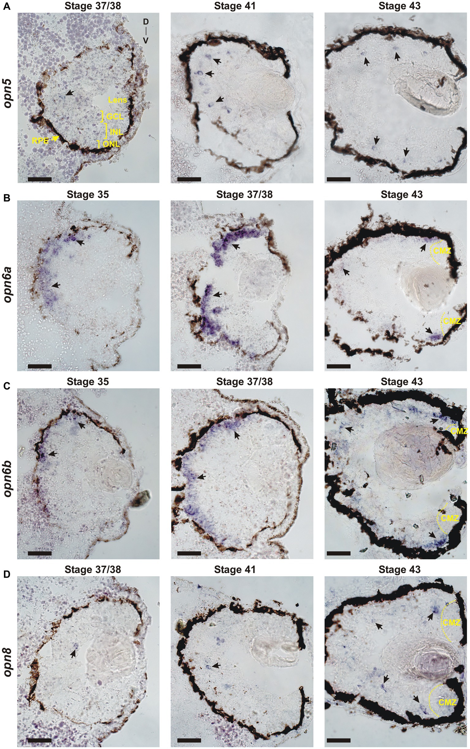 Figure 1. Developmental expression of neuropsins. ISH with specific antisense riboprobes against opn5 (A), opn6a (B), opn6b (C) and opn8 (D) on transverse retinal sections at stages 35, 37/38, 41 and 43. Black arrows point to neuropsin-expressing cells. CMZ, ciliary marginal zone; GCL, ganglion cell layer; INL, inner nuclear layer; ONL, outer nuclear layer; RPE, retinal pigment epithelium; D, dorsal; V, ventral. Scale bar = 100 μm.