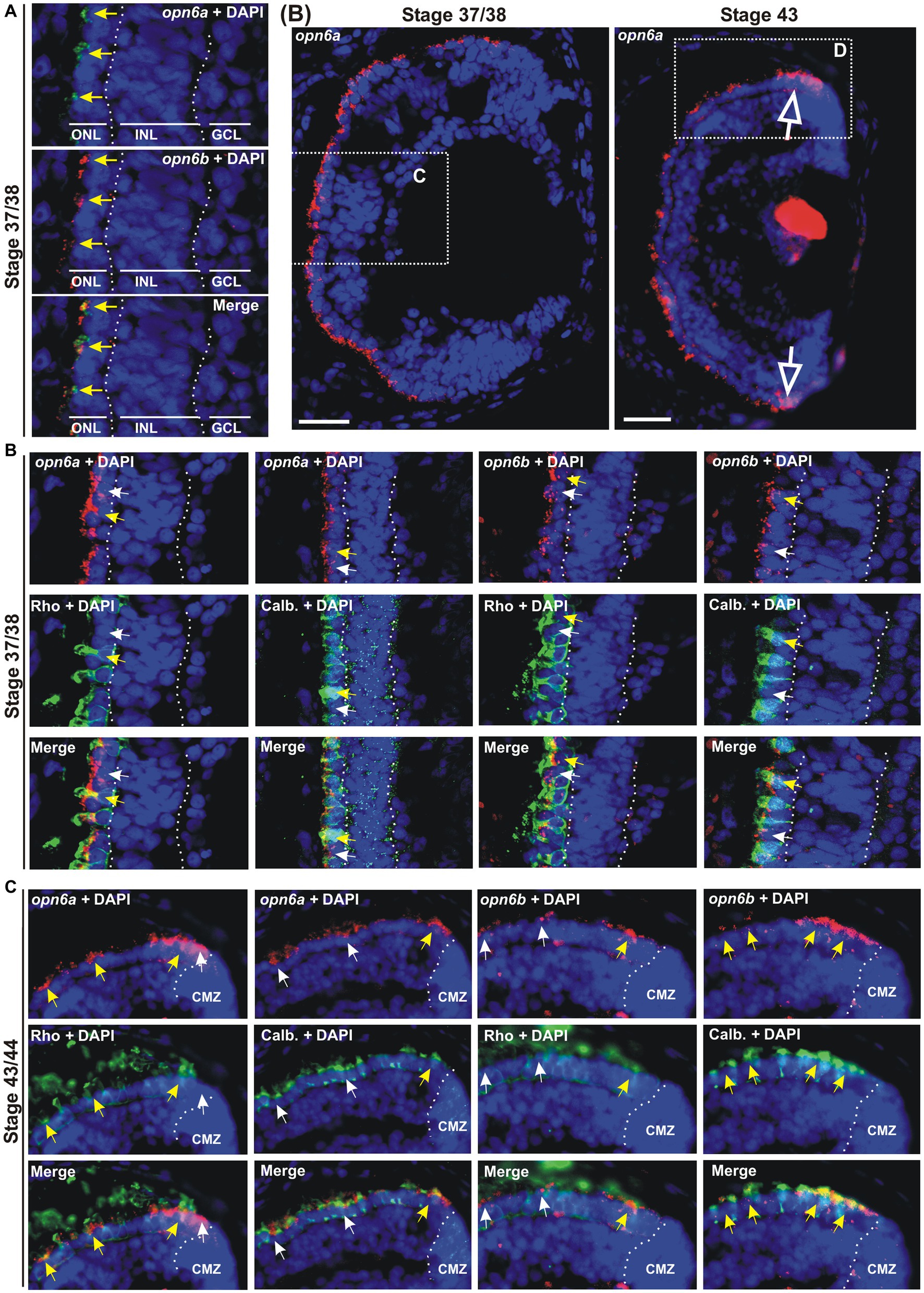 Figure 2. opn6a and opn6b colocalize in newly born photoreceptors at stage 37/38 but are differentially expressed in differentiated rods and cones at stage 43/44. (A–D) Fluorescent ISH with specific riboprobes against opn6a or opn6b on stage 37/38 (A,C) and 43/44 Xenopus laevis transverse retinal sections (B,D), followed by immunohistochemistry against a rod marker (rhodopsin; green) or a cone marker (calbindin; green) (C,D). DAPI (blue) stains nuclei. (A) Yellow arrows point to ONL cells that express both opn6a and opn6b. (B) Higher magnification of the dotted-line boxes are shown in bottom panels (C,D). The open white arrows point to opn6a+ cells that are adjacent to the ciliary marginal zone (CMZ). (C,D) White small arrows point to opn6a or opn6b expressing cells that are either not rhodopsin+ or not calbindin+, while yellow arrows indicate opn6a+ or opn6b+ cells that are also positive for rhodopsin or calbindin. GLC, ganglion cell layer; INL, inner nuclear layer; ONL, outer nuclear layer. Scale bar in (B): 100 μm.