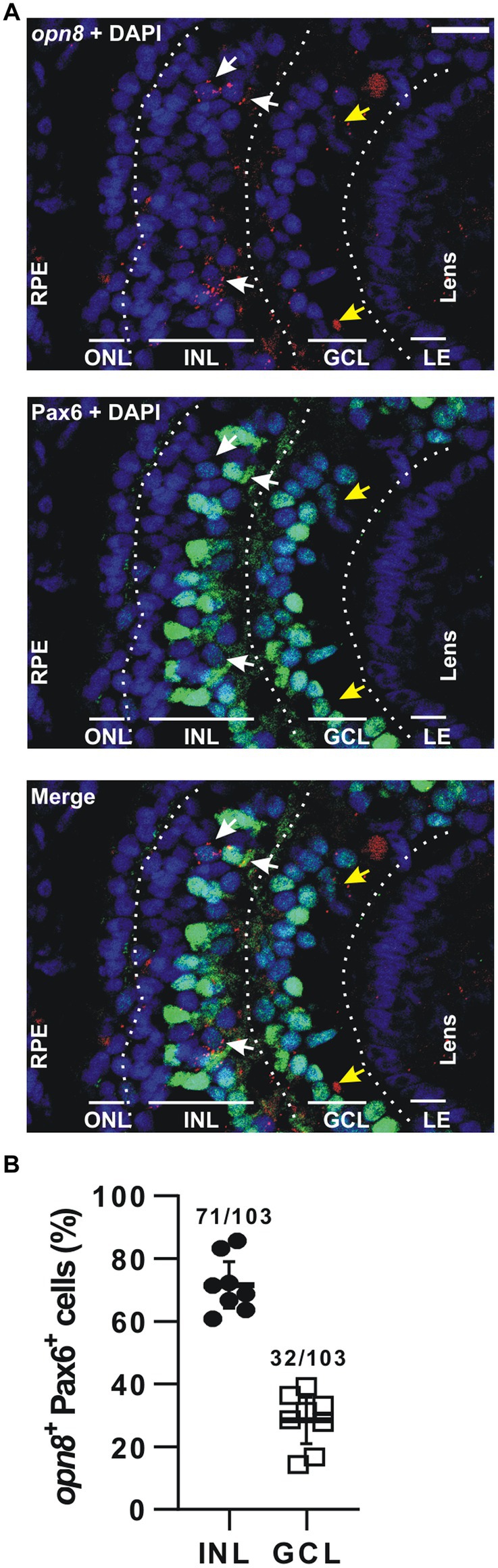 Figure 4. opn8 is expressed in Pax6+ cells in the INL and GCL. (A) Fluorescent ISH against opn8 (red) followed by immunohistochemistry against an amacrine and RGC marker (Pax6; green) on stage 41 Xenopus laevis transverse retinal section. DAPI (blue) stained the nucleus. ONL, INL, and GCL indicated with bars. White arrows point to opn8-expressing cells that are Pax6+ INL cells, while yellow arrows indicate Pax6+ GCL cells. GCL, ganglion cell layer; INL, inner nuclear layer; ONL, outer nuclear layer; RPE, retinal pigment epithelium. Scale bar = 50 μm. (B) Distribution of opn8+/Pax6+ cells between the INL and the GCL of stage 41 retinas. Each dot represents the percentage of cells in one central retina section (n = 8 sections); Lines are the mean with 95% confidence interval.