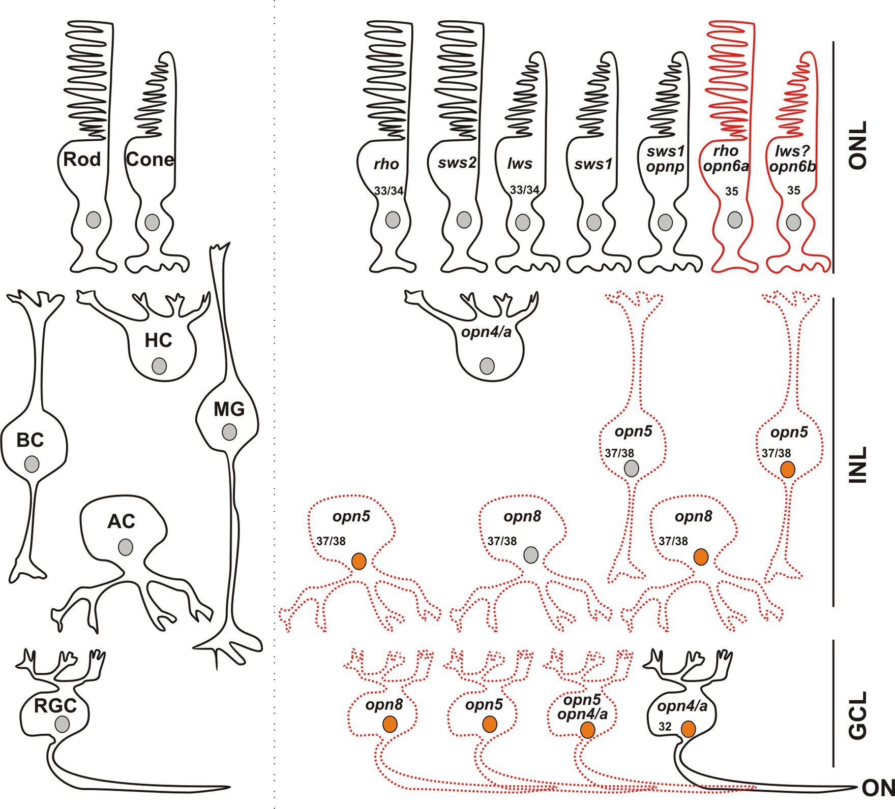 Figure 8. Opsin-expressing cells in the retina of a stage 43/44 Xenopus tadpole. Photoreceptors located in the outer nuclear layer (ONL) express the classical opsins in rods (rho or sws2; Kojima et al., 2017) and cones (lws and sws1). Pinopsin (opnp) is co-expressed in a few sws1+ cells (Bertolesi et al., 2021). Labeled with red are cells expressing opn6a and opn6b in rods (rho+) and cones, likely lws+, respectively. In the inner nuclear layer (INL), horizontal cells (HC) co-express the two melanopsin genes (opn4 and opn4a), bipolar cells (BC) express opn5, while amacrine cells (AC) express opn5 or opn8. Different cells in the ganglion cell layer (GCL) express opsins, including opn5, opn8, opn4/opn4a, and a few cells that contain opn4/a and opn5. Cells that express c-fos in response to exposure to white light are shown with an orange nucleus. Although classical photoreceptors are c-fos negative, they are highly likely activated by the white light exposure. We propose that opsin-expressing cells in the INL or GCL that exhibit light-induced c-fos expression serve as second- or third-order neurons, which receive synaptic inputs from photoreceptors or other retinal cells. We cannot rule out, however, that the opsin-expressing cells of the INL and GCL are intrinsically photosensitive and induce c-fos mRNA upon light stimulation, acting as first-order neurons. opn4/a+ HCs do not express c-fos while opn4/a+ RGCs do (Bertolesi et al., 2014). Opsin-expressing cells that we describe in this manuscript are either labeled with red solid lines (PR; photoreceptors), or red dotted lines as having the potential to be photosensitive in Xenopus, since direct light activation has not yet been demonstrated. Excluded are all the photoreceptors, and HCs and RGCs expressing melanopsins, for which photosensitivity was demonstrated in fish (Cheng et al., 2009) and mammals (Thoreson and Dacey, 2019). Numbers in the cells indicate the development stage of Xenopus when opsin expression is first detected (See also Table 1).