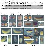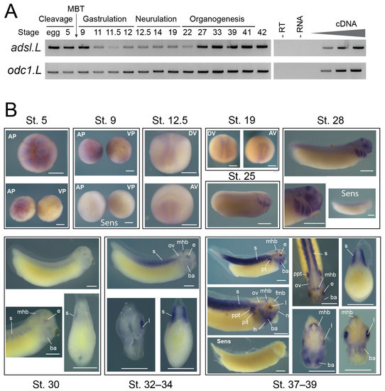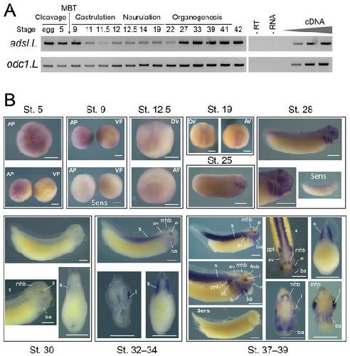 Figure 2. Spatiotemporal expression of adsl.L gene during X. laevis embryonic development. (A) Temporal expression profiles of adsl.L gene during embryogenesis. The expression profile was determined using RT-PCR from the cDNA of the fertilized oocyte (egg) and whole embryo at indicated stages covering the different phases of X. laevis embryogenesis. The ornithine decarboxylase gene odc1.L was used as a loading control and negative controls were performed by omitting either reverse transcriptase (-RT) or RNA (-RNA) in the reaction mix. Linearity was determined via dilutions of cDNA from stage 39 for adsl.L and 41 for odc1.L. Mid-blastula transition (MBT) is indicated. (B) Spatial expression profile of adsl.L gene during embryogenesis. Whole-mount in situ hybridization with adsl.L-specific DIG-labeled antisense or sense RNA probes was performed on embryos from stages (St.) 5 to 37–39. St. 5 and 9: animal (AP) and vegetal (VP) pole views, St. 12.5 and 19: dorsal (DV) and anterior (AV) views; later stages: lateral views, with dorsal up and anterior on the right, and dorsal view at stages 37–39. Transverse sections are dorsal up. Abbreviations: ba, branchial arches; e, eye; fmb, forebrain–midbrain boundary; h, heart; l, lens; mhb, midbrain–hindbrain boundary; n: nasal placode; ov, otic vesicle; ppt, pronephric proximal tubules; pit, pronephric intermediate tubules; s, somites. Bars: 0.5 mm. |