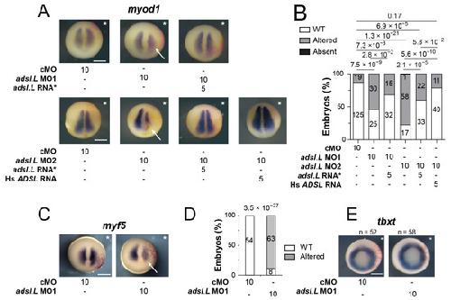 Figure 5. Expression of the myogenic regulatory factors myod1 and myf5 in paraxial mesoderm was strongly affected by the knockdown of the adsl.L gene. (A) Expression of myod1 gene at the early neurula stage was altered by the knockdown of adsl.L gene and rescued by adsl.L RNA* and human ADSL RNA. (C) Representative images of the effect on myf5 RNA expression by adsl.L knockdown at stage 12.5 revealed via in situ hybridization. (B,D) Quantification and statistics of the myod1 and myf5 expression phenotypes are presented in (A,C), respectively. (E) Knockdown of adsl.L did not alter the mesoderm formation, as revealed by the absence of change in tbxt (xbra) RNA expression domain at stage 11. Injected side is indicated by asterisks. The amounts of MO and RNA presented in this figure are in ng. Bars: 0.5 mm. Numbers above the bars of histograms correspond to p-values. White arrows point to the domain where expression of either myod1 or myf5 is altered. |