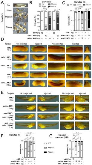 Figure 3. The adsl.L gene is required for somites and hypaxial muscle formation in X. laevis. (A) Representative images of adsl.L morphants following adsl.L MO1 injection at either 10 ng (weak and medium curvature) or 20 ng (medium and strong curvature). (B) Quantification and statistics of the curvature phenotype. (C–G) Immunostaining with the differentiated muscle-cell-specific 12-101 antibody revealed a strong alteration of somites and hypaxial muscle formation in adsl.L knockdown and adsl.L overexpressing embryos. Representative images (D,E) and quantification and statistics (C,F,G) of somites and hypaxial muscles phenotype at tailbud (C,D) and tadpole (E–G) stages. Injected side is indicated by asterisks. S, somites; HM, hypaxial muscles. Bars: 0.5 mm. White and red arrowheads point to typical somite chevron shapes and altered somites, respectively. The adsl.L RNA* refers to mutated RNA whose translation was not affected by the adsl.L specific MOs (Figure S3). Numbers above the bars of histograms correspond to p-values. |