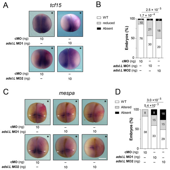 Figure 4. The adsl.L gene is required for the expression of tcf15 and mespa genes involved in early somitogenesis. Expression of tcf15 (A,B) and mespa (C,D) genes at late neurula stage is altered by the knockdown of adsl.L gene. Representative images of trf15 (A) and mespa (C) RNA expression revealed via in situ hybridization. Statistics are shown in (B) and (D) for trf15 and mespa RNA, respectively. White arrows point to the anterior domain of the somitomere S-II on both sides of the embryos. Injected side is indicated by asterisks. Numbers above the bars of histograms correspond to p-values. Bars: 0.5 mm. |