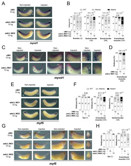 Figure 6. Knockdown of adsl.L gene caused an impaired expression of myod1 and myf5 at late tailbud and tadpole embryonic stages, leading to somites and craniofacial muscle formation defects. (A–D) Representative images of the adsl.L-dependent altered expression of myod1 (A) and myf5 (C) domains in either somite (S), dorsal somite border (DB), ventral somite border (VB) or craniofacial muscles (CM), as revealed via in situ hybridization in late tailbud embryos. Blue, red, green and purple arrowheads point to myod1 altered expression in somites, ventral border, craniofacial muscles and hypaxial muscles, respectively. (E,G) Representative images of the adsl.L-dependent altered expression of myod1 (E) and myf5 (G) domains in the unsegmented mesoderm in the most posterior tail (T), somites (S), ventral somite border (VB) and craniofacial muscles (CM) in tadpole embryos. Black and pink arrowheads point to myf5 altered expression in pharyngeal arch muscle enlagen intermandibularis muscle enlagen respectively. (B,D,F,H) Quantification and statistics of the myod1 and myf5 expression phenotypes presented in (A,C,E,G), respectively. Craniofacial muscles: ih, interhyoïedus anlage; im, intermandibularis anlage; lm, levatores mandibulae anlage; pam, pharyngeal archmuscle anlagen; q/oh, common orbitohyoïdeus and quadrato-hyoangularis precursors. Injected side is indicated by asterisks. Bars: 0.5 mm. Numbers above the bars of histograms correspond to p-values. |