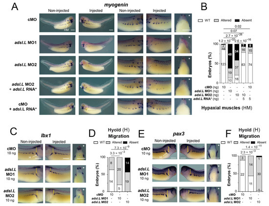 Figure 7. The adsl.L gene is required for hypaxial muscle migration. (A,B) The hypaxial muscle defect associated with adsl.L knockdown was rescued by the MO non-targeted adsl.L RNA*. Representative images (A) and quantifications (number in bars) and statistics (B) of the adsl.L-dependent alteration of myogenin gene expression monitored via in situ hybridization. (C–F) Migration of myoblasts in the hyoid region was found to be severely affected in adsl.L morphants, as shown by lbx1 (C,D) and pax3 (E,F) gene expression pattern alterations. Injected side is indicated by asterisks. Bars: 0.5 mm. HM and H stand for hypaxial muscles and hyoid region, respectively. Numbers above the bars of histograms correspond to p-values. |