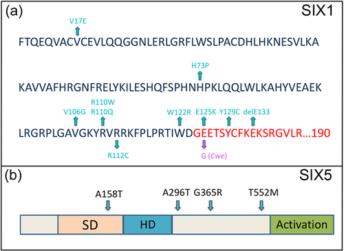Figure 1 (a) The amino acid sequence of the human and Xenopus Six Domain (SD, in the dark blue letters) and N-terminal residues of the Homeodomain (HD, in red letters) are identical. The known BOR-causing human variants are noted in teal using the human SIX1 amino acid numbers; seven are in the SD and three are in the HD. The Cwe variant is marked in magenta. The bait used for the Hybrigenics Y2H screen included the entire SD plus the entire HD extending to amino acid 190. (b) Schematic of the SIX5 protein showing the SD, HD, and C-terminal activation domains. The relative positions of the mutations found in BOR patients (Hoskins et al., 2007) are indicated. BOR, branchio-oto-renal; Y2H, yeast two-hybrid. |