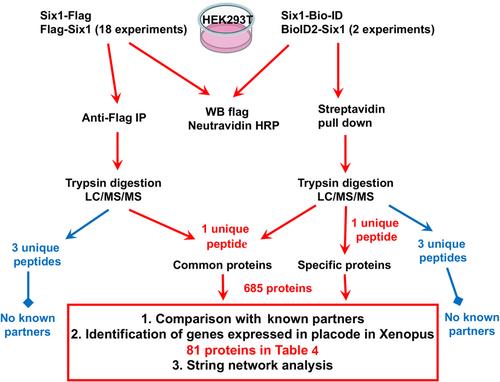 Figure 3 Overall view of the mass spectrometry (MS) experiments. Tagged Six1 constructs were transfected into HEK293T cells. Proteins were harvested, the expression level of Six1 was evaluated by Western blot (WB), and proteins associated with Six1 immunoprecipitated using either the anti-Flag-tag antibody (left side) or streptavidin beads (right side) for the Six1 Bio-ID2 transfections. All purified proteins were digested with trypsin and peptides were separated and identified by LC/MS/MS. Protein analysis was performed using two different criteria based on the number of unique high-confidence peptides (either three peptides or a one minimum of one peptide). None of the previously identified partners of Six1 were found on the list of the three unique peptides but were found in the list using one minimum peptide. The list of putative candidates was compared to genes expressed in Xenopus placodes (81 proteins in Table 4) and the common proteins were further analyzed using a String network analysis (Figure 4). HRP, horseradish peroxidase; IP, immunoprecipitation; LC/MS/MS, liquid chromatography with tandem mass spectrometry. |
