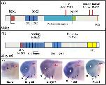 Figure 2 Candidate Six1 co-factors. (a) Schematic of the domains present in human and Xenopus Sobp proteins. Sobp contains a C-terminal nuclear localization signal (NLS), two FCS-type Zinc finger domains (ZF1 and ZF2), and a proline-rich region of 245 amino acids. Box 1 includes 20 amino acids that are identical in Xenopus and human proteins. Box 2 includes one of the FCS-type ZF domains. Box 3 is a 25 amino acid domain identical in Xenopus and human proteins. The amino acid locations of the known mouse and human SOBP mutations are indicated by red arrows. Each mutation introduces a stop codon (X) that truncates the protein (Birk et al., 2010; Chen et al., 2008). Box 2 and Box 3 were used in a BLAST search that identified Zmym2 and Zmym4 (Neilson et al., 2010). (b) Schematic of the domains present in human and Xenopus Zmym4 proteins. Like Sobp, it contains several FCS-type ZF domains and a C-terminal NLS. A presumed DNA-binding domain is located N-terminal to the ZFs. The yellow box indicates a DUF3504 domain. Regions of homology to Sobp Box 2 and Box 3 are indicated. (c) Wholemount in situ hybridization images of wild-type embryos indicating the expression domains of transcripts encoding Sobp, Zmym2, Zmym4, 2G4 and Mcrs1 (from Neilson et al., 2010). Red arrows indicate the otic vesicle, which gives rise to the inner ear. Arrows indicate the branchial arches, which give rise to elements of the middle ear (asterisks) and cranial cartilages. e, eye; Sobp, sine oculis binding protein. |