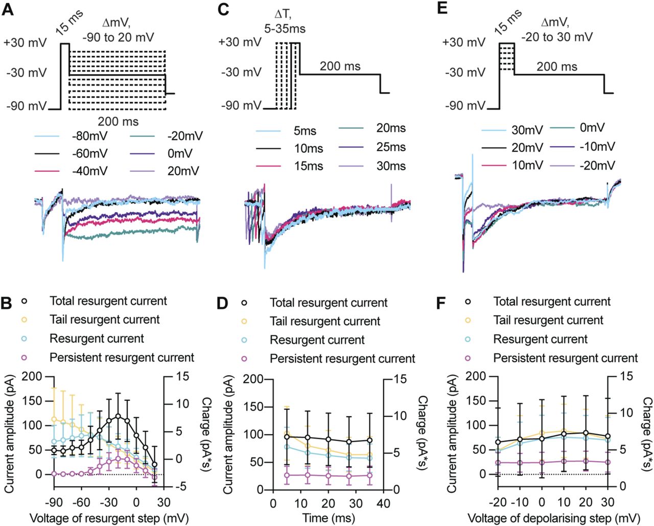 Figure S2. Characterizing the voltage and time dependency of the resurgent Na+ current. Resurgent Na+ currents result from a distinctive gating mechanism that traps Na+ channels in a blocked open-state, which is then relieved at depolarized potentials to generate a subthreshold depolarizing current. As a result, resurgent currents display distinct voltage dependency to repolarizing voltage steps, and are affected by the probability of Na+ channels entering the open state (voltage of the depolarizing step) or the inactivated/closed state (time of the depolarizing step). (A, B) The effect of altering the voltage of the repolarizing resurgent step on the identified components of the resurgent current. (A) Example voltage clamp recording showing the response of a single cell when the voltage of the repolarization step was increased from −90 to 20 mV. (B) Plot shows the average voltage dependency of each component of the resurgent current in tectal neurons. (C, D) The effect of altering the time of the depolarizing step on each component of the resurgent current. (C) Example voltage-clamp recording illustrating the response of a single cell when the depolarizing step was increased from 5–35 ms. (D) Plot shows the average voltage response for each component of the resurgent current as the time of the depolarizing step increases. (E, F) The effect of altering the voltage of the resurgent step on each component of the resurgent current. (E) Example voltage-clamp recording showing the response of a single cell when the voltage of the depolarizing step was changed from −20 to 30 mV. (F) Plot illustrates how altering the voltage dependency of the resurgent currents. Plots shown in (B, D, F) are mean ± SD; n = 27 tectal neurons. Resurgent currents are plotted on the left y-axis. Total resurgent current, calculated by measuring the area under the curve or charge (pA*s) over the 200 ms resurgent step, is plotted on the right y-axis. |