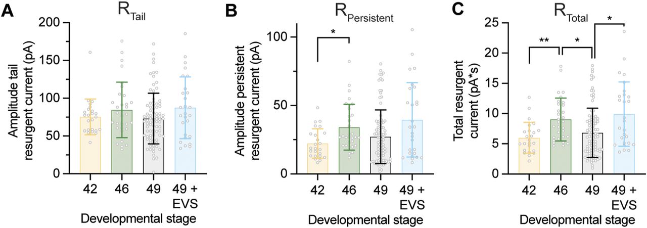 Figure S3. Quantification of changes in identified components of the resurgent Na+ current in Xenopus tectal neurons with changes in intrinsic excitability. Quantification of changes in identified components of the resurgent current across development and in response to 4 h of enhanced visual stimulation (EVS). (A) Peak amplitude of the tail resurgent Na+ current (RTail) ([in pA] Stage 42: 75.4 ± 23.7; Stage 46: 84.5 ± 36.7; Stage 49: 73.1 ± 33.5; Stage 49 + EVS: 87.4 ± 40.9). (B) Peak amplitude of the persistent resurgent Na+ current (RPersistent) ([in pA] Stage 42: 22.3 ± 10.8; Stage 46: 34.2 ± 16.7; Stage 49: 27.2 ± 19.7; Stage 49 + EVS: 39.5 ± 27.2). (C) The total resurgent Na+ current (RTotal) ([in pA*s] Stage 42: 5.99 ± 2.55; Stage 46: 9.02 ± 3.54; Stage 49: 6.82 ± 4.07; Stage 49 + EVS: 9.91 ± 5.31). Groups were compared using a Welch’s ANOVA test with Dunnett T3 test for multiple comparisons. n = 24–87 cells. |