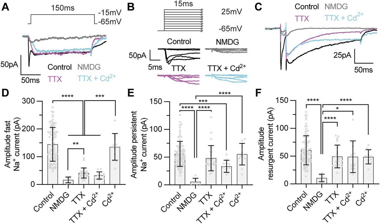 Figure 4. The persistent and resurgent Na+ currents, but not the fast Na+ current, are insensitive to tetrodotoxin (TTX). (A, B, C) Example voltage-clamp recordings from tectal neurons with a Tris-based internal solution to isolate Na+ currents from stage 49 tectal neurons in control conditions (black), in zero Na+ external solution (NMDG) to block all inward Na+ currents (grey), in 1 µM TTX to block TTX-sensitive Na+ currents (magenta), or in 100 nM Cd2+ to block Ca2+ currents (cyan). (A) Example recordings show fast and persistent from a single depolarizing step to −15 mV for each experimental group. (A, B) Magnification of the initial 15 ms of the recordings shown in (A) to a series of voltage steps (−65 to +25 mV) to highlight the effect of each treatment on the fast Na+ current. Note that TTX attenuates fast but not persistent Na+ currents, whereas blocking all Na+ influx by replacing external Na+ with NMDG attenuates both fast and persistent currents to reveal a small, presumptive Ca2+ current. (C) Example recordings illustrating the effect of each condition on the resurgent Na+ current. (D, E, F) Quantification of peak amplitudes for the (D) fast, (E) persistent, and (F) resurgent Na+ currents for each experimental group. Groups were compared using a Welch’s ANOVA test with Dunnett T3 test for multiple comparisons. n values for (D, E, F) were 87 stage 49 controls, 15 NMDG, 27 TTX, 11 TTX + Cd2+, and 12 Cd2+. Values and comparisons are shown in Table S2. |