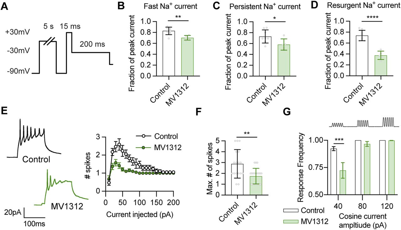 Figure 5. The Nav1.6 specific inhibitor MV1312 decreases intrinsic excitability by reducing fast, persistent, and resurgent Na+ currents in a use-dependent manner. (A) To measure the effect of Nav1.6 channel inhibition on Na+ currents, we performed whole-cell recordings in the presence or absence of 5 µM of the specific Nav1.6 channel inhibitor MV1312. We recorded Na+ currents before and after a 5 s depolarizing step to 0 mV to promote channel opening and drug binding, and then calculated the fraction of each Na+ current that remained. (B, C, D) Quantification of the fraction of initial peak current amplitude for the (B) fast Na+ current (Control: 0.82 ± 0.07, n = 8, MV1312: 0.70 ± 0.04, n = 5; P = 0.0038), (C) persistent Na+ current (Control: 0.73 ± 0.12, MV1312: 0.58 ± 0.10; P = 0.0439), and (D) the resurgent Na+ current (Control: 0.74 ± 0.10, MV1312: 0.38 ± 0.08; P < 0.0001). Groups were compared with an unpaired t test. (E, F) MV1312 decreases intrinsic excitability of tectal neurons by attenuating Na+ current amplitude. (E, F, G) The effect of MV1312 on intrinsic excitability was observed by measuring (E) spikes generated by current injection, (F) the maximum number of spikes generated by current injection (Control: 2.88 ± 1.32, n = 17; MV1312: 1.75 ± 0.72, n = 20; P = 0.0021), and (G) the capacity of cells to spike in response to 200 ms cosine current injections at 30 Hz with increasing amplitudes from 40 to 120 pA (response frequency [% of current injections resulting in a spike]. 40 pA: Control 0.93 ± 0.02, n = 16, MV1312 0.72 ± 0.07, n = 19; P = 0.0002; 80 pA: Control 1.00 ± 0.00, n = 16, MV1312 0.97 ± 0.02, n = 19; P = 0.7429; 120 pA: Control 1.00 ± 0.00, n = 16, MV1312 0.99 ± 0.01, n = 19; P = 0.9712. Groups were compared using a two-way ANOVA with a Holm–Sidak test for multiple comparisons). |