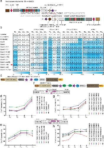 Figure 1 Engineered DdCBE variants show enhanced editing at TC, non-TC target sequences in mtDNA. a) Schematic of engineered DdCBE variants targeting ND1 (m.G3635) gene in the mitochondrial genome. b) Heat map showing C·G-to-T·A editing efficiencies induced by DddA (WT-DdCBE), DddA6, DddA11, and DddA11-fused cytosine deaminases with ssDNA activity in HEK293T cells at five mitochondrial target sites, including TRNL1, ND1, ND4, and RNR1. The cytosines in the top strands or bottom strands are presented as C-to-T conversion frequencies. The nucleotide adjacent to the end of the left-TALE-recognition sequence was numbered “‘1,”’ and C was sequentially numbered. For the heatmap, the number is given in units of %. Top 10% of EGFP- and mCherry-double positive cells were harvested from FACS 48 h after transfection. The targeting efficiency was tested by targeted deep sequencing. c) Architectures of DddA11-xAID with the reported high-fidelity mutations. d,e) Analysis of C·G-to-T·A editing frequencies at ND1 (m.G3635) and ND4 (m.G11642) sites induced by DddA11-xAID with high-fidelity mutations, including Q1310A, K1389A, T1391A, and V1411A. f) Architectures of DddA11-T1391A-xAID fused different nuclear export signal (NES) sequences. g,h) Analysis of C·G-to-T·A editing frequencies at ND1 (m.G3635) and ND4 (m.G11642) sites induced by DddA11-T1391A-xAID fused NES sequences. Values and error bars in (b), (d,e), and (g,h) reflect the mean ± s.e.m. of n = 3 independent biological replicates. |