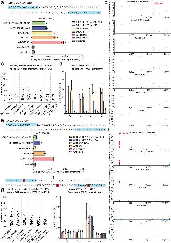 Figure 3 Off-target analysis for engineered DdCBE and TALED variants targeting to the ND4 (m.G11642) and RNR1 (m.A1555) sites. a) The average frequencies of mitochondrial genome-wide off-target editing induced by Dead-DdCBE, wild-type DdCBE (WT-DdCBE), DddA11, DddA11-xAID, DddA11-T1391A-xAID, and DddA11-T1391A-xAID-NES2 specific to the ND4 (m.G11642) site. Error bars are s.e.m. for n = 2 biologically independent samples. b) Mitochondrial genome-wide plots for C-to-T point mutations with frequencies ≥1%. Naturally occurring SNVs, on-target edits (including bystander edits in the editing window) and off-target edits are shown in gray, red, and blue, respectively. All data points from n = 2 biologically independent experiments are shown. c) Genome-wide off-target analysis for engineered DdCBE variants targeting the ND4 (m.G11642) site. The C·G-to-T·A editing frequencies of each unique SNV are shown for the Dead-DdCBE, WT-DdCBE, and our engineered DdCBE variants. d) The corresponding nuclear DNA sequence with the greatest homology (mismatch = 0) is shown for the ND4 (m.G11642) site. Editing efficiencies are measured by targeted deep sequencing (see Table S4 for primer sequences) (Supporting Information). Data are presented as means ± SEM. e) The average frequencies of mitochondrial genome-wide off-target editing induced by CN-sTALED, 6CN-AD, 6CN-AD-V106W, 6CN-Q1310A-AD-V106W, and 6CN-Q1310A-AD-V106W-NES1 specific to the RNR1 (m.A1555) site. Error bars are s.e.m. for n = 2 biologically independent samples. f) Mitochondrial genome-wide plots for A-to-G point mutations with frequencies ≥1%. Naturally occurring SNVs, on-target edits (including bystander edits in the editing window) and off-target edits are shown in gray, red, and blue, respectively. All data points from n = 2 biologically independent experiments are shown. g) Genome-wide off-target analysis for engineered TALED variants targeting the RNR1 (m.A1555) site. The A·T-to-G·C editing frequencies of each unique SNV are shown for CN-sTALED and our engineered TALED variants. h) The corresponding nuclear DNA sequence with the high homology (mismatch = 3) is shown for the RNR1 (m.A1555) site. TALE binding sites begin at N0 and are shown in blue. Nucleotide mismatches between the mtDNA and nuclear pseudogene are in red. Editing efficiencies are measured by targeted deep sequencing (see Table S4 for primer sequences) (Supporting Information). Data are presented as means ± SEM. |