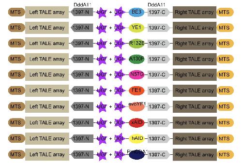 Figure S1. Schematic showing the architectures of DddA11 fused ten cytosine deaminases with ssDNA activity used in this study. MTS, mitochondrial targeting sequence; UGI, uracil glycosylase inhibitor; BE3 = rat APOBEC1; YE1 = BE3W90Y+R126E; R132E = BE3R132E; A130F = human APOBE3AA130F; N57G = human APOBE3AN57G; FE1 = BE3W90F+R126E; evoYE1 = engineered BE3W90Y+R126E; xAID = Xenopus laevis activation-induced cytidine deaminase (AID); hAID = human activation-induced cytidine deaminase (AID); PmCDA1 = petromyzon marinus cytidine deaminase 1. |