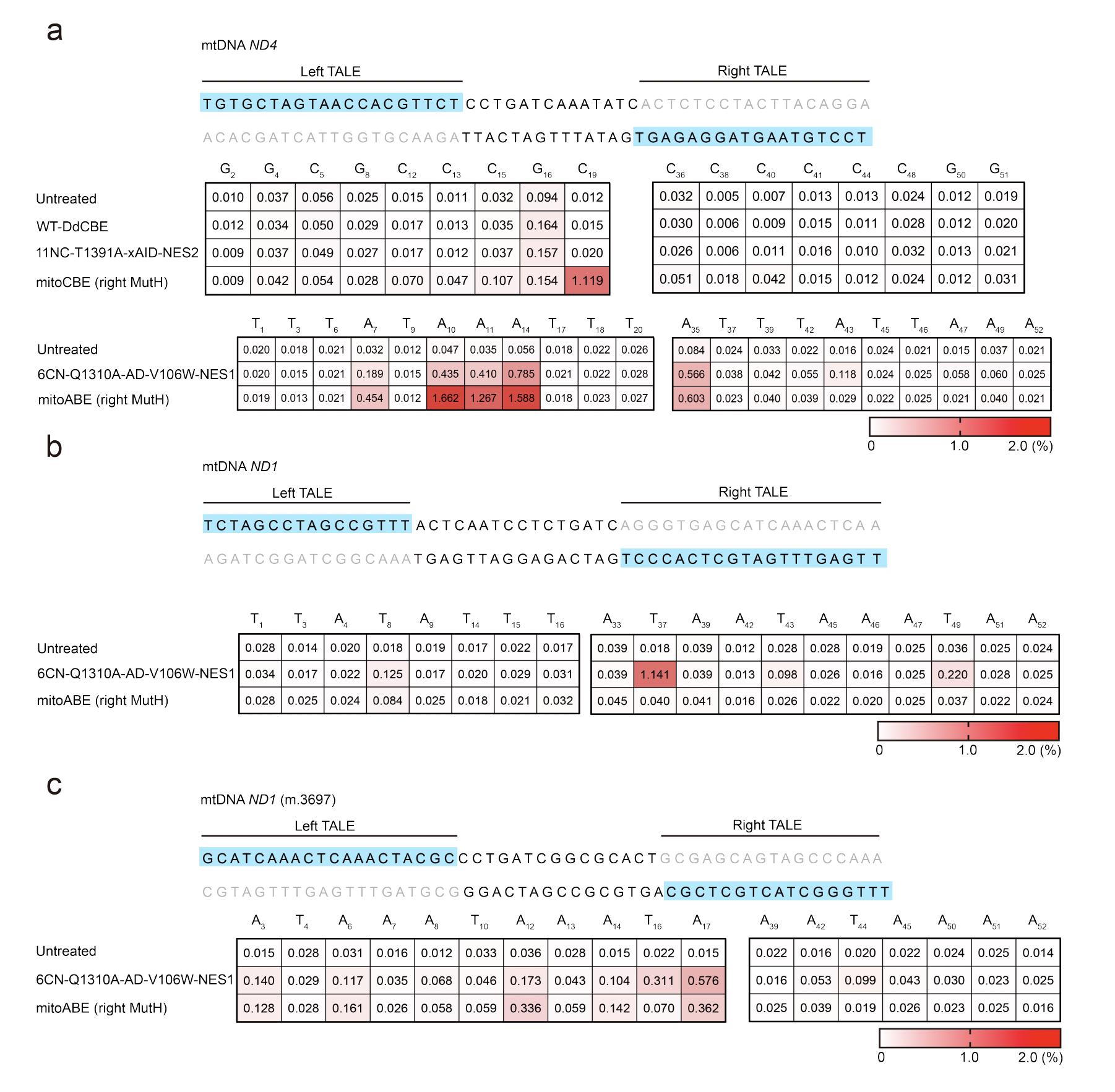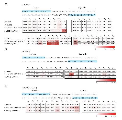 Figure S2. Bystander edits in the TALE binding sites and positions flanking the binding sites. a) Bystander C-to-T and A-to-G edits in the TALE binding sites and positions flanking the binding sites for WT-DdCBE, 11NC-T1391A-xAID-NES2, mitoCBE (right MutH), 6CN-Q1310A-AD-V106W-NES1, and mitoABE (right MutH) tools at mitochondrial ND4 site. b-c) Bystander A-to-G edits in the TALE binding sites and positions flanking the binding sites for CN-Q1310A-AD-V106W-NES1 and mitoABE (right MutH) tools at mitochondrial ND1 and ND1 (m.G3697) sites. The nucleotide adjacent to the start of the left-TALE-recognition sequence was numbered ‘‘1,’’ and C, G, T, or A were sequentially numbered. Top 10% of EGFP- and mCherry-double positive cells were harvested from fluorescence-activated cell sorting (FACS) 48 h after transfection. The editing efficiency was tested by targeted deep sequencing. The number is given in units of %. All values are presented as the average of n = 3 biologically independent experiments. |