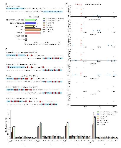 Figure S8. Off-target analysis for engineered DdCBEs and TALEDs specific to the ND4 (m.G11642) and RNR1 (m.A1555) sites on nuclear DNA in HEK293T cells. a) The other nuclear DNA sequence with the high homology is shown for the ND4 (m.G11642) site. TALE binding sites begin at N0 and are shown in blue. Nucleotide mismatches between the mtDNA and nuclear pseudogene are in red. Editing efficiencies are measured by targeted deep sequencing (see Table S4 for primer sequences) (Supporting Information). Data are presented as means ± SEM. b) The other nuclear DNA sequence with the high homology are shown for the RNR1 (m.A1555) site. TALE binding sites begin at N0 and are shown in blue. Nucleotide mismatches between the mtDNA and nuclear pseudogene are in red. Editing efficiencies are measured by targeted deep sequencing (see Table S4 for primer sequences) (Supporting Information). Data are presented as means ± SEM. |