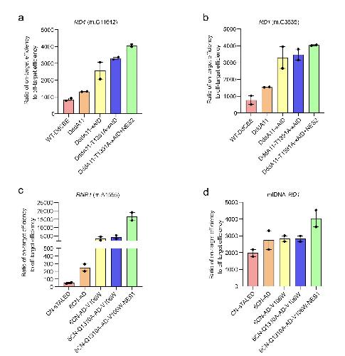 Figure S9. The ratio of on-target efficiency to off-target efficiency for each variant. a-b) The ratio of on-target efficiency to off-target efficiency for our engineered DdCBE variants at ND4 (m.G11642) and ND1 (m.G3635) sites. c-d) The ratio of on-target efficiency to off-target efficiency for our engineered TALED variants at RNR1 (m.A1555) and ND1 sites. All data points from n = 2 biologically independent experiments are shown. Data are presented as means ± SEM. |