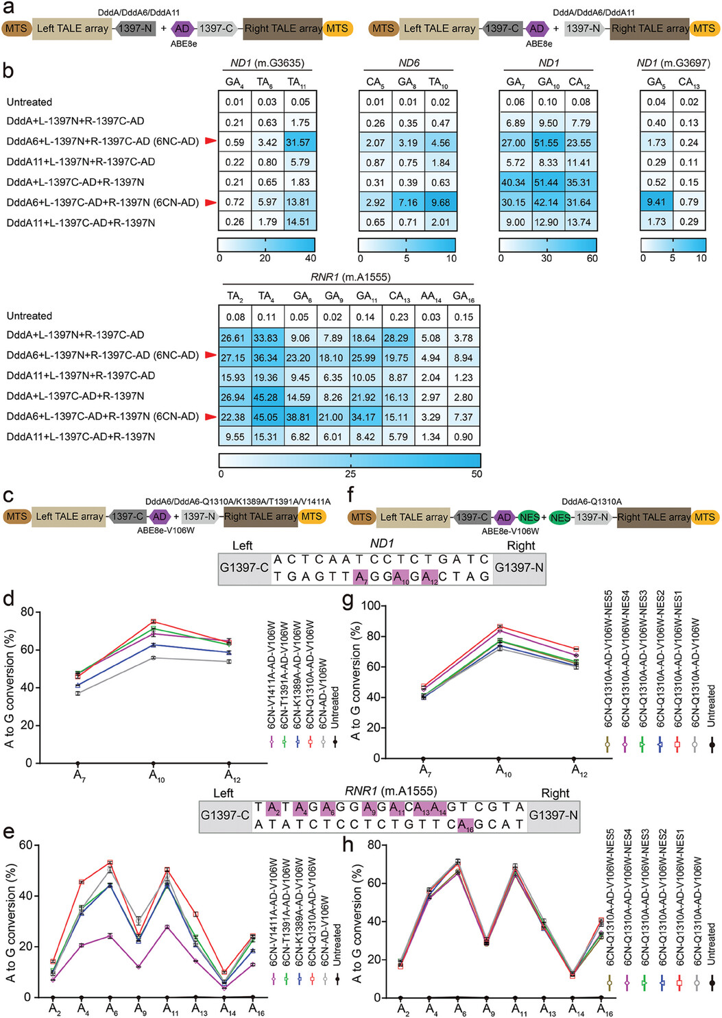 Figure 2. TALEDs fused evolved DddA6 achieve high‐efficiency editing at multiple mtDNA loci. a) Architectures of TALEDs with the evolved DddA6 or DddA11 variants. b) Heat map showing A·T‐to‐G·C editing efficiencies induced by TALED, TALED‐DddA6, and TALED‐DddA11 in HEK293T cells at five mitochondrial target sites, including ND1, ND6, and RNR1. TALEDs fused DddA6 variant and the split DddAtox orientation at G1397 position that resulted in the higher editing efficiencies. The adenines in the top strands or bottom strands are presented as A‐to‐G conversion frequencies. The nucleotide adjacent to the end of the left‐TALE‐recognition sequence was numbered “‘1,”’ and A was sequentially numbered. For the heatmap, the number is given in units of %. Top 10% of EGFP‐ and mCherry‐double positive cells were harvested from FACS 48 h after transfection. The targeting efficiency was tested by targeted deep sequencing. c) Architectures of 6CN‐AD‐V106W with the reported high‐fidelity mutations of DddA. d,e) Analysis of A·T‐to‐G·C editing frequencies at ND1 and RNR1 (m.A1555) sites induced by 6CN‐AD‐V106W with high‐fidelity mutations, including Q1310A, K1389A, T1391A, and V1411A. f) Architectures of 6CN‐Q1310A‐AD‐V106W fused different nuclear export signal (NES) sequences. g,h) Analysis of A·T‐to‐G·C editing frequencies at ND1 and RNR1 (m.A1555) sites induced by 6CN‐Q1310A‐AD‐V106W fused NES sequences. For (b), (d,e), and (g,h), values and error bars reflect the mean ± s.e.m. of n = 3 independent biological replicates. |