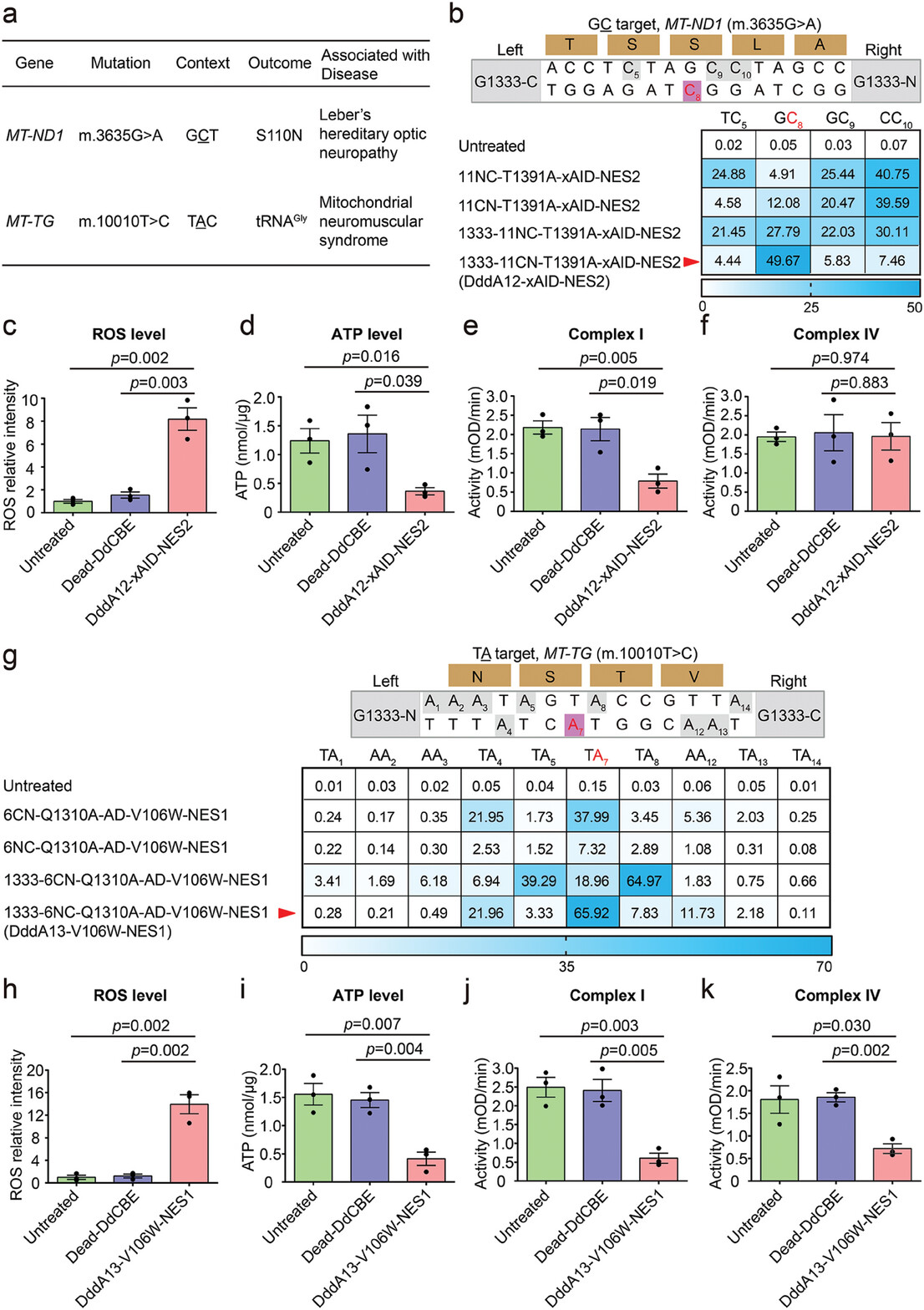 Figure 4 Application of high-fidelity DdCBE and TALED variants to install pathogenic mutations in HEK293T cells. a) Using high-fidelity DdCBE and TALED variants to install disease-associated target mutations in human mtDNA (S, serine; N, asparagine). b) Mitochondrial C-to-T editing efficiencies of HEK293T cells treated with DddA11-T1391A-xAID-NES2 variant at G1397 and G1333 orientation of split DddAtox for the mitochondrial ND1 (m.G3635) site in previously inaccessible GC targets. On-target cytosines are colored red or gray, respectively. Top 30% of EGFP- and mCherry-double positive cells expressing the DdCBE variants were isolated by FACS for targeted deep sequencing. The split orientation, target spacing region, and corresponding encoded amino acids are shown. 11NC-T1391A-xAID-NES2, Right–G1397-C + Left–G1397-N orientation; 11CN-T1391A-xAID-NES2, Right–G1397-N + Left–G1397-C orientation; 1333-11NC-T1391A-xAID-NES2, Right–G1333-C + Left–G1333-N orientation; 1333-11CN-T1391A-xAID-NES2 (DddA12-xAID-NES2), Right–G1333-N + Left–G1333-C orientation. Shown are means ± SEM; n = 3 independent experiments. The transfection time was 2 days. For the heatmap, the number is given in units of %. c–f) The levels of intracellular ROS (c), ATP (d) and the activities of complex I (e), complex IV (f) in sorted HEK293T cells treated with the DddA12-xAID-NES2 or Dead-DdCBE for the ND1 (m.G3635) site. mOD, absorbance at optical density of 450 nm (complex I activity) or 550 nm (complex IV activity). Data are presented as means ± SEM. p values were evaluated with the unpaired student's t-test (two-tailed). All data points from n = 3 biologically independent experiments are shown. g) Mitochondrial A-to-G editing efficiencies of HEK293T cells treated with 6CN-Q1310A-AD-V106W-NES1 variant at G1397 and G1333 orientation of split DddAtox for the mitochondrial TG (m.T10010) site. On-target adenines are colored red or gray, respectively. Top 30% of EGFP- and mCherry-double positive cells expressing the TALED variants were isolated by FACS for targeted deep sequencing. The split orientation, target spacing region and corresponding encoded amino acids are shown. 6CN-Q1310A-AD-V106W-NES1, Right–G1397-N + Left–G1397-C orientation; 6NC-Q1310A-AD-V106W-NES1, Right–G1397-C + Left–G1397-N orientation; 1333–6CN-Q1310A-AD-V106W-NES1, Right–G1333-N + Left–G1333-C orientation; 1333–6NC-Q1310A-AD-V106W-NES1 (DddA13-V106W-NES1), Right–G1333-C + Left–G1333-N orientation. Shown are means ± SEM; n = 3 independent experiments. The transfection time was 2 days. For the heatmap, the number is given in units of %. h–k) The levels of intracellular ROS (h), ATP (i) and the activities of complex I (j), complex IV (k) in sorted HEK293T cells treated with the DddA13-V106W-NES1 or Dead-DdCBE for the TG (m.T10010) site. Data are presented as means ± SEM. p values were evaluated with the unpaired student's t-test (two-tailed). All data points from n = 3 biologically independent experiments are shown. |