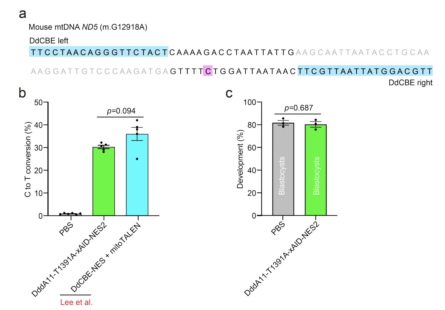 Figure S10. Engineered DdCBE variant mediates high editing efficiency in mouse blastocyst. a) Base editing target for generating the m.G12918A mutation. The TALE binding sequences for the DdCBE are highlighted in blue and for the base editing position in purple. b) The base editing efficiency of DddA11-T1391A-xAID-NES2 targeted ND5 (m.G12918) in mouse blastocysts. The data of the DdCBE-NES + mitoTALEN group were cited from Lee et al.. c) Developmental rate for PBS-injected embryos and injected embryos with DddA11-T1391A-xAID-NES2 targeting ND5 (m.G12918). Data are presented as the mean ± SEM. p values were evaluated with unpaired Student’s t-test. |