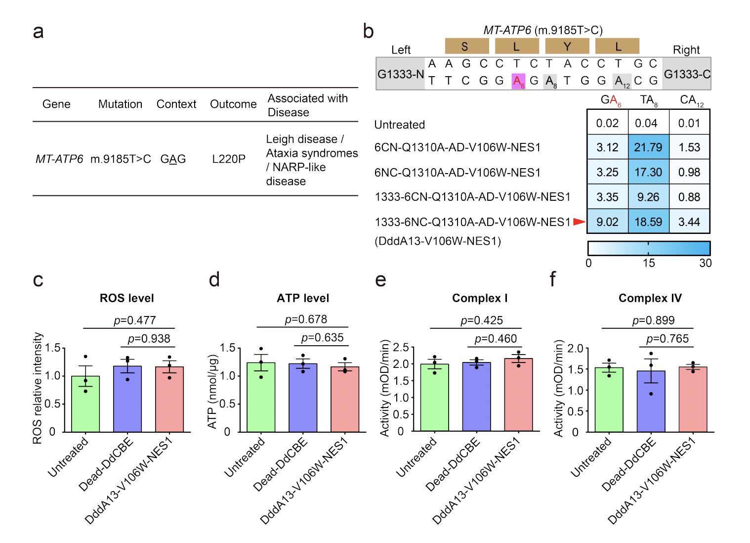 Figure S11. Application of high-fidelity TALED variant to install pathogenic mutations in HEK293T cells. a) Use high-fidelity TALED variant to install disease-associated target mutations in human mtDNA (L, leucine; P, proline). b) Mitochondrial A-to-G editing efficiencies of HEK293T cells treated with 6CN-Q1310A-AD-V106W-NES1 variant at G1397 and G1333 orientation of split DddAtox for the mitochondrial ATP6 (m.T9185) site. On-target adenines are colored red or gray, respectively. Top 30% of EGFP- and mCherry-double positive cells expressing the TALED variants were isolated by FACS for targeted deep sequencing. The split orientation, target spacing region and corresponding encoded amino acids are shown. 6CN-Q1310A-AD-V106W-NES1, Right–G1397-N + Left–G1397-C orientation; 6NC-Q1310A-AD-V106W-NES1, Right–G1397-C + Left–G1397-N orientation; 1333-6CN-Q1310A-AD-V106W-NES1, Right–G1333-N + Left– G1333-C orientation; 1333-6NC-Q1310A-AD-V106W-NES1 (DddA13-V106W-NES1), Right–G1333-C + Left–G1333-N orientation. Shown are means ± SEM; n = 3 independent experiments. The transfection time was 2 days. c-f) The levels of intracellular reactive oxygen species (ROS) (c), ATP (d) and the activities of complex I (e), complex IV (f) in sorted HEK293T cells treated with the DddA13-V106W-NES1 or Dead-DdCBE for the ATP6 (m.T9185) site. Data are presented as means ± SEM. p values were evaluated with the unpaired student’s t-test (two-tailed). All data points from n = 3 biologically independent experiments are shown. |