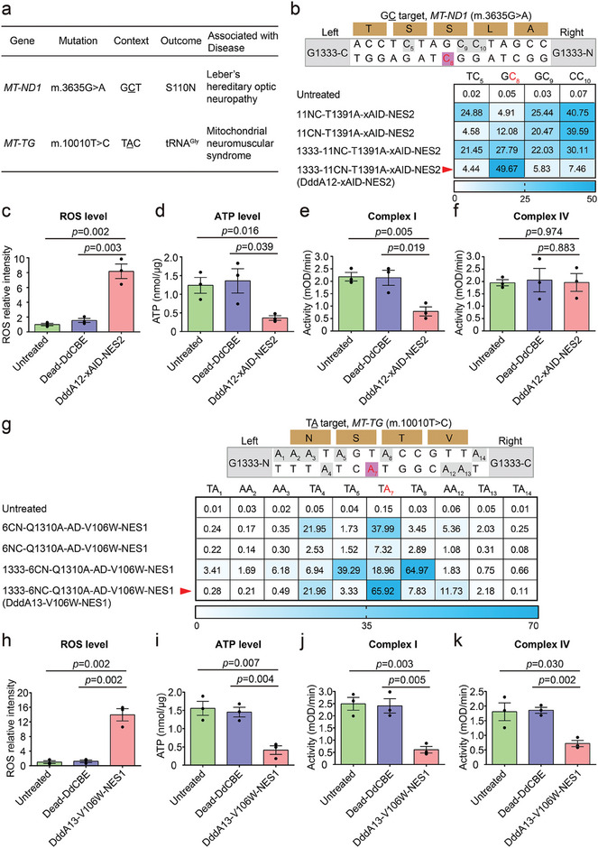 Figure 4. Application of high‐fidelity DdCBE and TALED variants to install pathogenic mutations in HEK293T cells. a) Using high‐fidelity DdCBE and TALED variants to install disease‐associated target mutations in human mtDNA (S, serine; N, asparagine). b) Mitochondrial C‐to‐T editing efficiencies of HEK293T cells treated with DddA11‐T1391A‐xAID‐NES2 variant at G1397 and G1333 orientation of split DddAtox for the mitochondrial ND1 (m.G3635) site in previously inaccessible GC targets. On‐target cytosines are colored red or gray, respectively. Top 30% of EGFP‐ and mCherry‐double positive cells expressing the DdCBE variants were isolated by FACS for targeted deep sequencing. The split orientation, target spacing region, and corresponding encoded amino acids are shown. 11NC‐T1391A‐xAID‐NES2, Right–G1397‐C + Left–G1397‐N orientation; 11CN‐T1391A‐xAID‐NES2, Right–G1397‐N + Left–G1397‐C orientation; 1333‐11NC‐T1391A‐xAID‐NES2, Right–G1333‐C + Left–G1333‐N orientation; 1333‐11CN‐T1391A‐xAID‐NES2 (DddA12‐xAID‐NES2), Right–G1333‐N + Left–G1333‐C orientation. Shown are means ± SEM; n = 3 independent experiments. The transfection time was 2 days. For the heatmap, the number is given in units of %. c–f) The levels of intracellular ROS (c), ATP (d) and the activities of complex I (e), complex IV (f) in sorted HEK293T cells treated with the DddA12‐xAID‐NES2 or Dead‐DdCBE for the ND1 (m.G3635) site. mOD, absorbance at optical density of 450 nm (complex I activity) or 550 nm (complex IV activity). Data are presented as means ± SEM. p values were evaluated with the unpaired student's t‐test (two‐tailed). All data points from n = 3 biologically independent experiments are shown. g) Mitochondrial A‐to‐G editing efficiencies of HEK293T cells treated with 6CN‐Q1310A‐AD‐V106W‐NES1 variant at G1397 and G1333 orientation of split DddAtox for the mitochondrial TG (m.T10010) site. On‐target adenines are colored red or gray, respectively. Top 30% of EGFP‐ and mCherry‐double positive cells expressing the TALED variants were isolated by FACS for targeted deep sequencing. The split orientation, target spacing region and corresponding encoded amino acids are shown. 6CN‐Q1310A‐AD‐V106W‐NES1, Right–G1397‐N + Left–G1397‐C orientation; 6NC‐Q1310A‐AD‐V106W‐NES1, Right–G1397‐C + Left–G1397‐N orientation; 1333–6CN‐Q1310A‐AD‐V106W‐NES1, Right–G1333‐N + Left–G1333‐C orientation; 1333–6NC‐Q1310A‐AD‐V106W‐NES1 (DddA13‐V106W‐NES1), Right–G1333‐C + Left–G1333‐N orientation. Shown are means ± SEM; n = 3 independent experiments. The transfection time was 2 days. For the heatmap, the number is given in units of %. h–k) The levels of intracellular ROS (h), ATP (i) and the activities of complex I (j), complex IV (k) in sorted HEK293T cells treated with the DddA13‐V106W‐NES1 or Dead‐DdCBE for the TG (m.T10010) site. Data are presented as means ± SEM. p values were evaluated with the unpaired student's t‐test (two‐tailed). All data points from n = 3 biologically independent experiments are shown. |