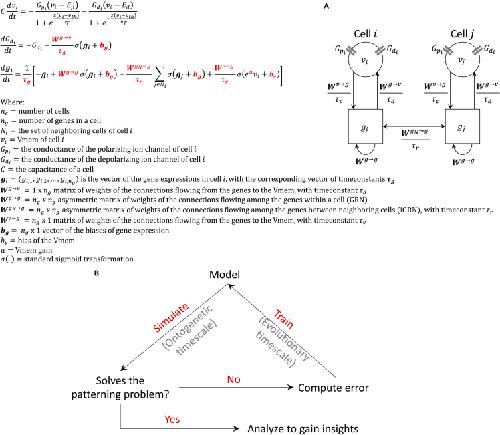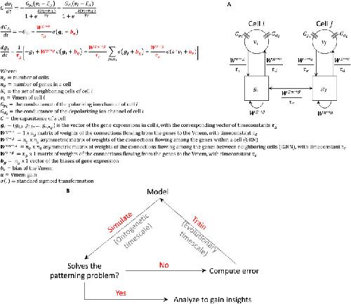 Figure 2. Overview of the mathematical details of the neural plate circuit model and the process of identifying its parameters (training) (A) The equations defining the model, with the variables and parameters mapped to a simplified two-cell version (the rest of the model is symmetrical to this version). The parameters (red) are learned using machine-learning techniques. The bioelectric constants, namely, , , , and , are described in ref.88 and in Tables S1–S8. (B) The model is trained using a combination of genetic algorithm and gradient descent. The final model referred to throughout this paper is a product of a training loop that starts with a population of randomly parametrized models, simulates all of them, and then modifies them using genetic algorithm and gradient descent to improve their ability to solve the pattern discrimination problem. |