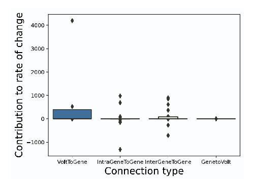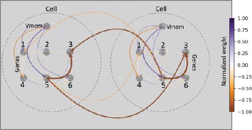 Figure 3. Architecture of the chosen high-performing model Depicted here is the connectivity of a two-cell version of the full model; the rest of the network is symmetrical to this version (full model parameters described in Tables S1–S8). For clarity, we show only about 20% of the strongest connections (10% of the most positive in purple and 10% of the most negative in orange/brown); edge weights are linearly normalized to the range (−1, 1). The most prominent connections run from the voltage to gene 5 (purple), with a positive weight, and among genes 3 and 5 both within a cell and between cells (brown), with a negative weight. Connections running from genes to voltage do exist in the full model, but they were filtered out due to their weak weights. |