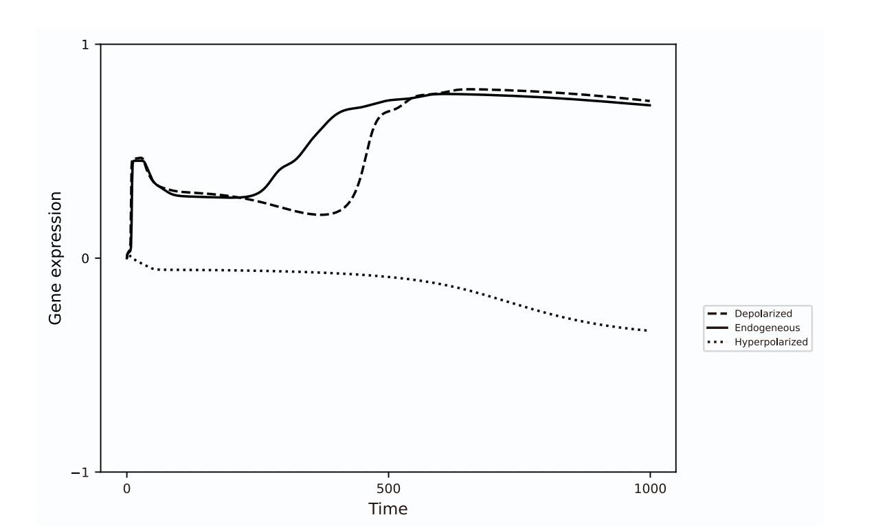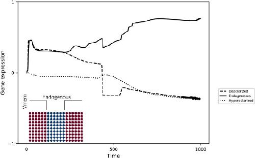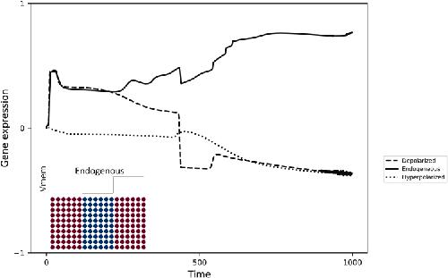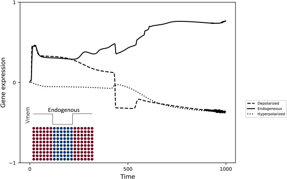 Figure S12. The timeseries of the discriminator gene following the severing of the connections running from the genes to the Vmem in all cells. It can be seen that the detection of the depolarized voltage pattern is affected, though the behavior with respect to the other patterns are preserved. Related to Fig. 7. |