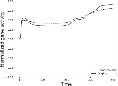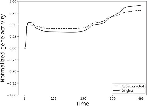 Figure S9. Gene-wise Hessian reconstruction of timeseries. A comparison of the normalized original gene expression timeseries of all the genes (dashed) and the corresponding reconstruction (solid) from the second order (Hessian) influence of the Vmem. The resemblance between the reconstruction and the original indicates that most of the gene activity is determined by its second-order relationship with Vmem. This moreover also suggests a canalization-like mechanism where the dynamics of this complex recurrent model is simplified in such a way that there is an almost direct control of the discriminator gene by the Vmem, as if the paths through the other genes are bypassed; this canalized pathway cannot be inferred from the structure of the static connectivity (Fig 3) alone. This makes intuitive sense since discriminatory behavior requires a comparison of Vmem of different cells, which the Hessian presumably aides by containing the differential information. Due to the symmetry of the model, only the genes contained by the cells in the 2x3 top left quadrant of the full 4x6 tissue (dashed boxes in Fig 9) were considered for these calculations; the Hessian depicted here is the sum of all Hessians corresponding to each cell in the quadrant. Related to Fig. 7. |