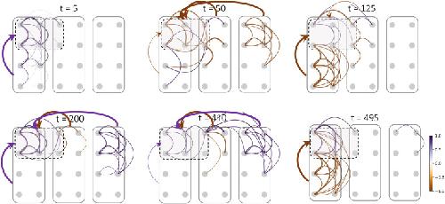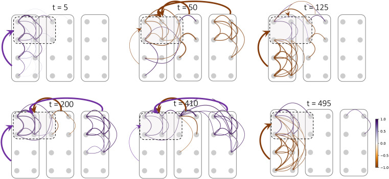 Figure 8. Spatiotemporal dynamics of the second-order control of gene expression by the endogenous voltage patternEach undirected edge represents a pair of cells whose voltages collectively influence the expression of an average discriminator gene in the top left quadrant. The weight of these edges indicates the degree of influence (second-order derivative) exerted by the voltages of the corresponding pairs of cells on the discriminator gene, whereas their colors indicate whether the influence is positive or negative (strong purple means strongly positive and strong orange/brown means strongly negative). These edges represent the summation term in the equation g6(t+1)ˆ=g6(t)ˆ+∑j∈TL∑l=1nc∑k=1nccH[6]∂2g6,j(t)∂Gpl∂Gpk(0), where TL refers to the set of cells in the top left quadrant of the tissue and cH was optimized to fit the observed normalized {g6(t)ˆ} with the initial condition g6(0)ˆ=0. Only the cells in the 2x3 top left quadrant of the full 4x6 tissue (dashed boxes) were considered because the model is bilaterally symmetrical both about the vertical and horizontal axes. For clarity, only about 10% of the observed edges are shown. The arrows running from one band to another serve as a visual illustration of the average weighted and signed influence exerted by the three bands on the target top left quadrant of the pattern. |