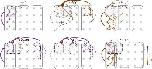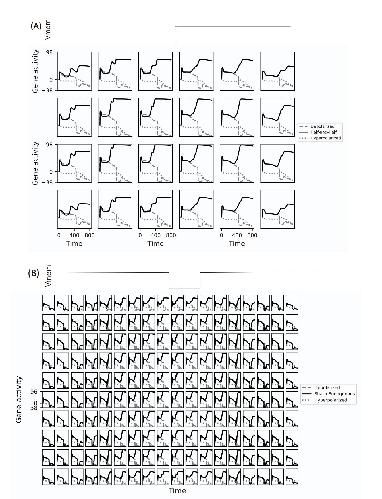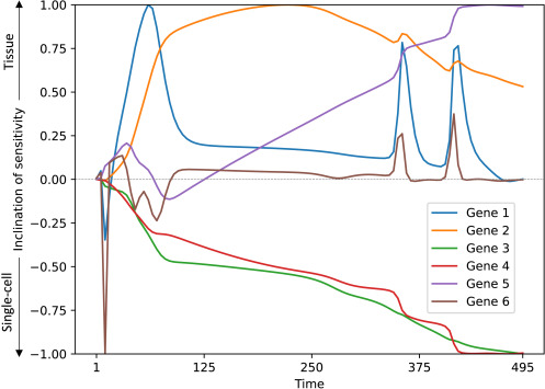 Figure 9. A division of labor exists among the genes in terms of their sensitivities to the different spatial scales of the voltage pattern The difference between the first-order (Jacobian) directional derivatives of the gene activities computed with respect to the voltage at the tissue level and the single-cell level tends to be positive for genes 2 and 5, negative for genes 3 and 4, and mostly balanced but interspersed with positive spurts for genes 1 and 6. This quantity, known as the net scale sensitivity of a gene, is defined as . Here, the first term is a directional derivative and computes the net sensitivity to the tissue, and the second term refers to the single cell. The term is a normalization term for computing the directional derivative along the direction of the unit vector, thus enabling the comparison between the two scales of the tissue and the single cell. The corresponding inclinations of sensitivity are toward the tissue level, single-cell level, and an intermediate level, respectively. Due to the symmetry of the model, only the genes contained by the cells in the 2x3 top left quadrant of the full 4x6 tissue were considered for these calculations. |