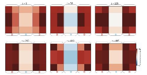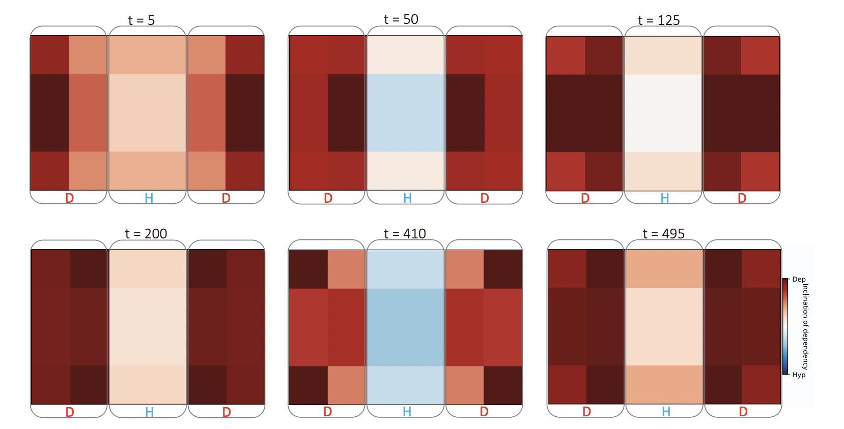 Figure S5. The time-evolution of context-dependency of the individual cells in a 4x6 tissue while solving the pattern discrimination problem. The color of each cell indicates the extent to which the connections of that cell in the corresponding Hessian network originate from another depolarized cell in the left or the right bands or a hyperpolarized cell in the central band. Related to Fig. 8. |