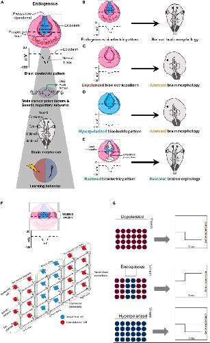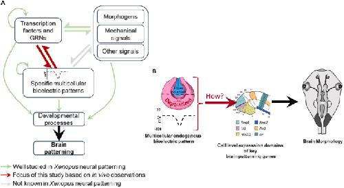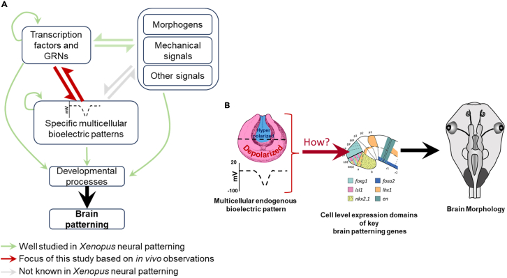 Figure 13. An overview of the current knowledge and gaps in our understanding of Xenopus brain development (A) A schematic of the general state of our knowledge in embryonic brain patterning and the area of focus of this study. (B) A schematic of the functional relationship in which a spatial pattern (the characteristic bell curve voltage distribution, left panel) is transduced into specific gene expression decisions (middle panel, taken from with permission from ref.84) that is required to implement mature brain anatomy (right panel). |