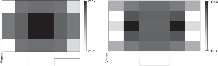 Figure 10. Model predictions about the responses to two types of non-endogenous input voltage patterns with different polarization ratios simulated in a 10x18 tissueAverage activity levels of the discriminator gene in response to (A) a voltage pattern with a less skewed ratio of polarization in comparison to the endogenous pattern: a half-and-half (step function) voltage pattern where the left half is hyperpolarized and the right half is depolarized (inset); (B) a voltage pattern with a more skewed ratio of polarization in comparison to the endogenous pattern: a sharpened voltage pattern where the overall pattern is maintained but the hyperpolarized neural plate (central band) is only a third of its original normal size (inset). |