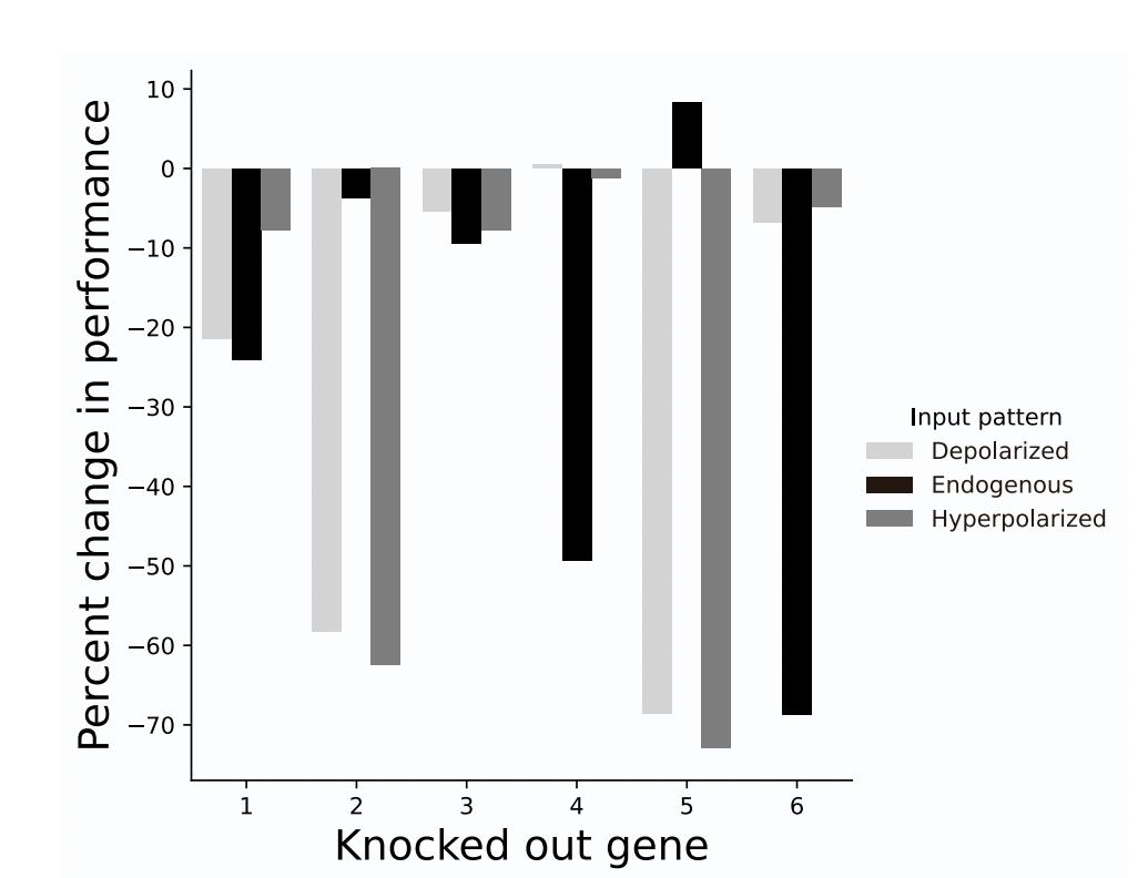 Figure S11. Differential effect of gene knockouts on the performance of the model for each of the three input bioelectric patterns. It can be noticed that gene 6 effects the largest drop in performance for the endogenous pattern while contributing very little to processing the other patterns. While gene 4 behaves in a similar fashion as gene 6, genes 2 and 5 behave conversely where they most affect the depolarized and the hyperpolarized pattens while contributing very little to the endogenous pattern. Gene 3 appears to be the most redundant gene of the lot by affecting very little the performance with respect to all three patterns. Related to Fig. 9. |