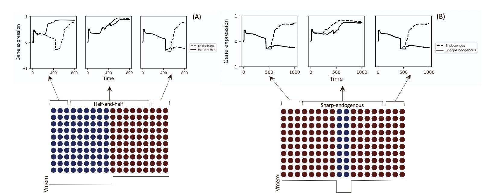 Figure S14. A more nuanced analysis of the gene activities for the half-and-half and the sharp-endogenous patterns. Panels display gene expression timeseries averaged over the cells in the first 3 columns, the middle 12 columns and the last 3 columns. (A) Response to a voltage pattern with a less skewed ratio of polarization: a half-and-half (step function) voltage pattern where the left half is hyperpolarized, and the right half is depolarized (inset) should result in normal brain development as indicated by the mean gene expression of the discriminator gene, averaged over all cells, discriminating it from the other patterns. (B) Response to a voltage pattern with a more skewed ratio of polarization: a sharpened voltage pattern where the overall pattern is maintained but the hyperpolarized neural plate (central band) is only a third of its original normal size (bottom panel: only the middle two columns are depolarized). Related to Fig. 10. |
