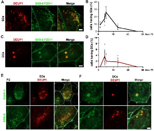 Fig. 3. Deuterosomes are transiently present in differentiated ependymal cells in vivo.(A and C) Whole mount staining of LWs using Deup1, SAS6, and ZO-1 antibodies at P2. Scale bars = 2 µm. (B and D) LW associated SDs and DCs were quantified in each field from mice at P1, P4, P5, P13, and P26. SD-positive cells increased up to 25.95% at P5 and no longer existed for the P26 samples. A very small number of DC-positive cells were observed at P4, reaching 3.65% in the counted. The data are presented as mean ± SD. (E and F) Whole mount staining of LWs for Deup1 and Centrin (top panels) or Deup1 and SAS6 (bottom panels). To mark the boundary of each cell, staining with ZO-1 antibody (green) was performed. Scale bar = 2 µm. LW, lateral wall; SDs, scattered deuterosomes; DCs, deuterosome clusters.