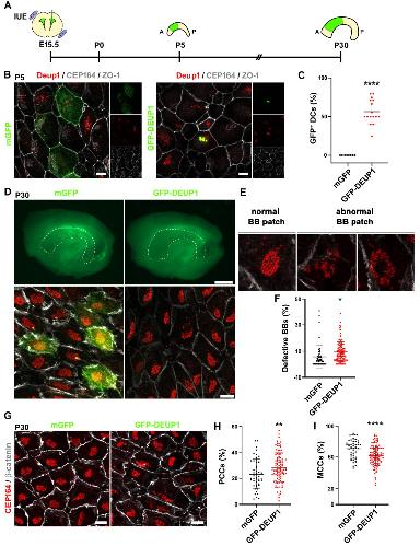 Fig. 4. Deup1 expression in ependymal tissue disrupts ependymal differentiation to multiciliated cells (MCCs).(A) Schematic illustration of an in utero electroporation (IUE) experiment. In the lateral wall (LW) region marked with green color, GFP is abundantly observed in the region analyzed. A, anterior; P, posterior. (B) Whole mount staining of electroporated LWs using Deup1, CEP164, and ZO-1 antibodies at P5. mGFP-transfected cells showed a broad pattern of green signal within each cell, while GFP-Deup1 transfected cells showed distinct GFP-positive deuterosome clusters (DCs). Scale bars = 5 µm. (C) The data presented in B were used to calculate the percentage of cells with GFP-positive DCs in each microscopic field. In the mGFP group, 35 GFP-positive cells from two injected mice were analyzed; in the GFP-Deup1 group, 80 GFP-positive cells from three injected mice were analyzed. The data are presented as mean ± SD. ****P < 0.0001. (D) Fluorescent images of the electroporated LWs at P30 at low magnification. In contrast to the mGFP signals in control cells, GFP signals were barely visible in the LWs electroporated with GFP-Deup1 (top panel). Scale bar = 1 mm. Furthermore, whole mount staining of LWs using CEP164 (red) and β-catenin (gray) antibodies also revealed an identical result (bottom panel). Scale bar = 10 µm. (E) Images of normal or abnormal basal body (BB) patches in LWs electroporated with GFP-Deup1. (F) A quantitative analysis was performed on the percentage of cells with abnormal BB patches. The GFP control group had 5.76% of cells with defective BB patches, while the GFP-DEUP1 group had 9.33% of cells. The data are presented as mean ± SD. *P < 0.05. (G) Confocal microscopic image of CEP164 and β-catenin staining. Scale bars = 10 µm. (H and I) The numbers of primary ciliated cells (PCCs) and MCCs were determined based on their CEP164 staining and normalized by the total number of cells in each field. Note that cells with an abnormal BB patch were not included for PCC or MCC counts. The data are presented as mean ± SD. **P < 0.01, ****P < 0.0001. For the mGFP group, n = 48 fields from 5 mice, and for the GFP-DEUP1 group, n = 105 fields from 11 mice were examined.