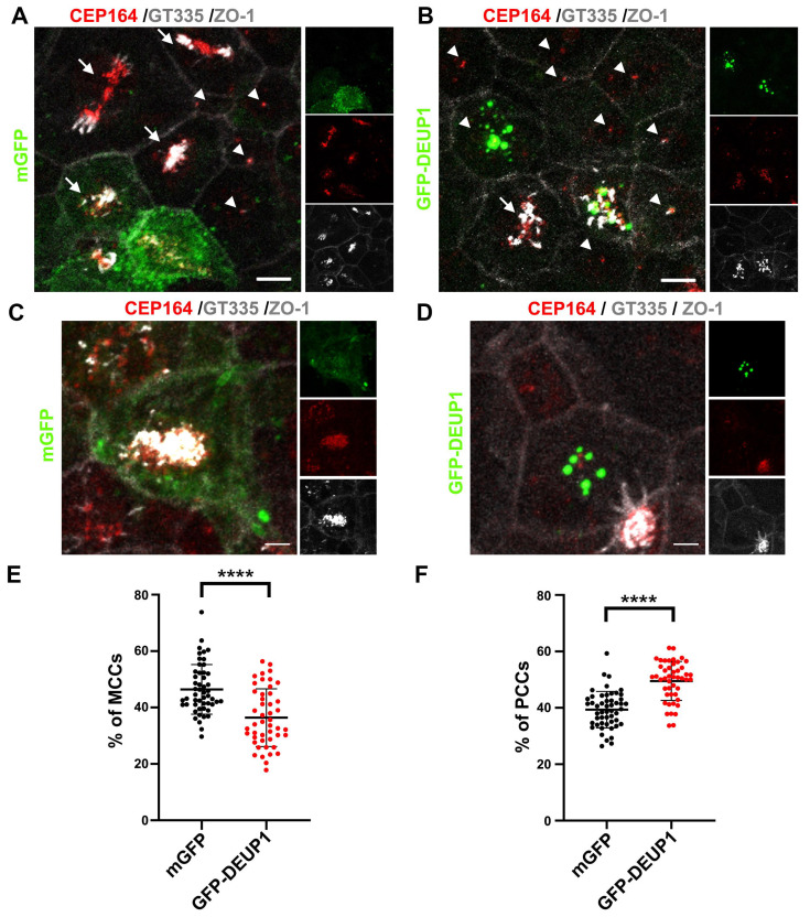 Fig. 2. Gain-of-function of Deup1 inhibits the differentiation of ependymal precursor cells into multiciliated cells in vitro.(A and B) Confocal microscopy analysis of ependymal cells at differentiation day (dd) 14. Transfected cells with mGFP or GFP-Deup1 were analyzed with GFP signals in green, BBs with CEP164 in red, cilia with GT335 in gray, and cell boundaries with ZO-1 in gray. The right panel shows each fluorescence at a low magnification. Scale bars = 10 µm. (C and D) Representative images of transfected cells showing BBs (red, CEP164) and cilia (gray, GT335). It is noteworthy that most of the Deup1 transfected cells had GFP-positive DCs at this stage of differentiation. Scale bars = 5 µm. (E and F) MCCs and PCCs were quantified in each field regardless of GFP signal. The data are presented as mean ± SD. For the mGFP control arm, n = 51 fields were collected from 12 plates; for the GFP-Deup1 group, n = 47 fields were collected from 11 plates. The data were compared using a two-tailed t-test. ****P < 0.0001. BBs, basal bodies; DCs, deuterosome clusters; MCCs, multiciliated cells; PCCs, primary ciliated cells.