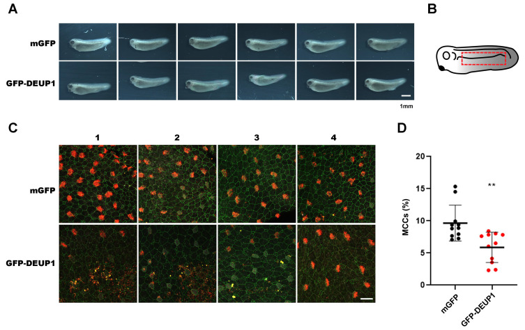 Fig. 6. Ectopic expression of Deup1 in Xenopus laevis disrupts the differentiation of multiciliated cells (MCCs) in the epidermis.(A) The diagram shows the overall morphology of various Xenopus embryos at stage 32 after injection of the indicated RNAs. Embryos that were morphologically normal were selected for further immunostaining in this study. Scale bar = 1 mm. (B) This diagram illustrates the region in which differentiated MCCs were analyzed. (C) Whole embryos were immunostained for acetylated tubulin and ZO-1, which serve as markers of multicilia and cell boundaries, respectively. The number on top of each panel represents an independent embryo for each group injected. Scale bar = 50 µm. (D) The number of MCCs in each field was calculated and then expressed as a percentage after dividing by the total number of cells. The data are presented as mean ± SD. **P < 0.01. The total number of embryos analyzed for each injection group was 11.