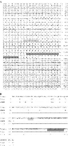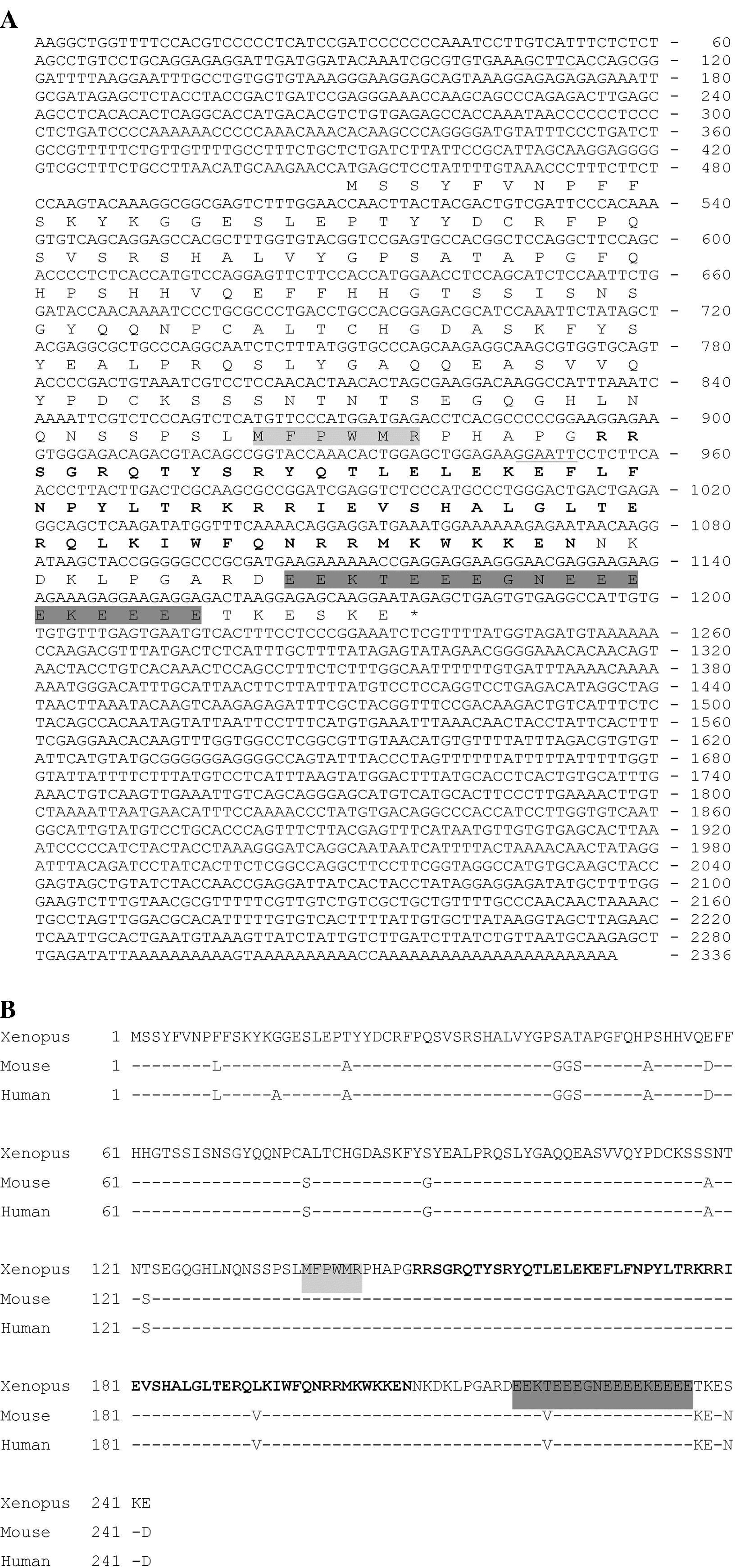 Nucleotide and deduced amino acid sequences of Xhoxc8 mRNA. (A) Deduced amino acid sequences are indicated. EcoRI (AAGCTT) and HindIII (GAATTC) sites are underlined. These sequences are deposited in the GenBank database under Accession No. AF001596. (B) Protein sequence comparison among different species. Sequences of mouse [18] and human [19] were compared with Xenopus sequence. Dash lines indicate the identical amino acids; bold letters indicate homeobox; hexapeptide region is lightly shaded; polyglutamic acid stretch is heavily shaded.