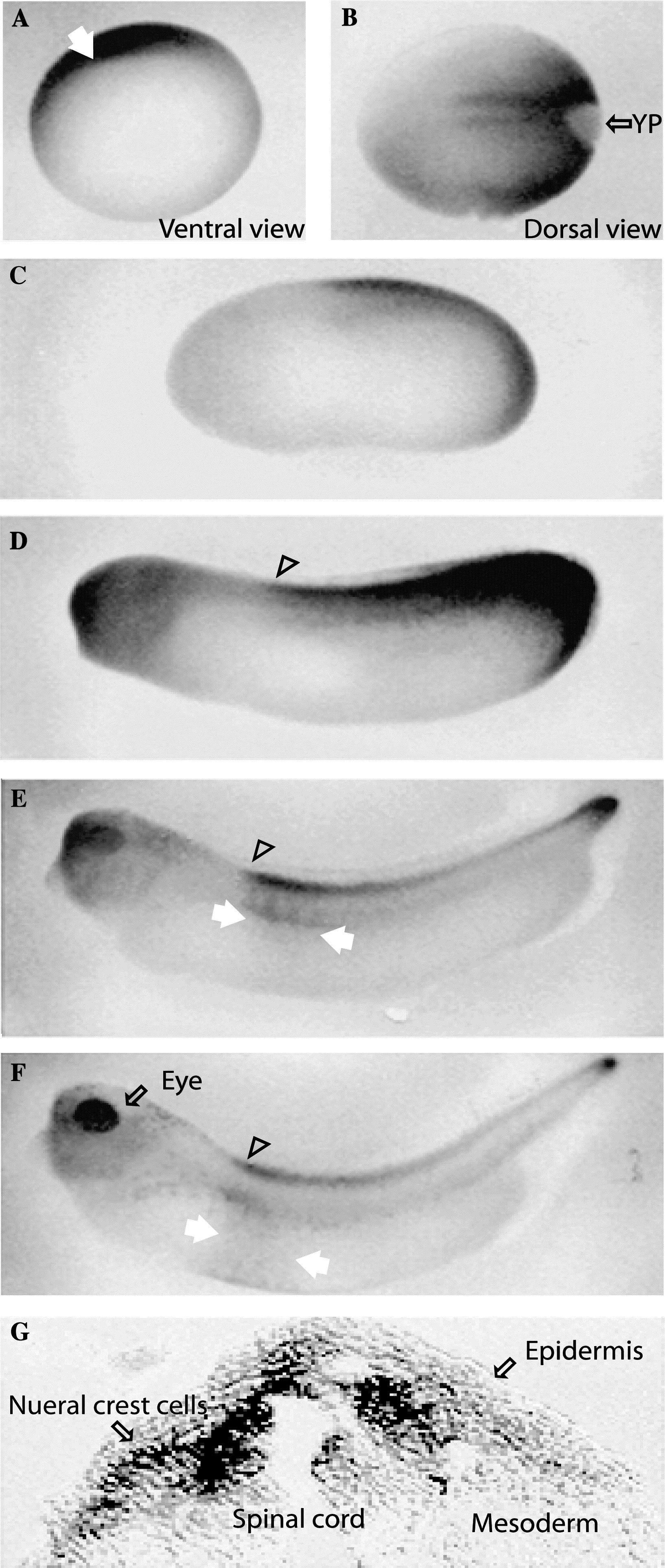 In vivo Xhoxc8 expression pattern. Whole-mount in situ hybridization was performed using the same probe used for Northern and Southern blot analyses. (A) Ventral view of stage 10 embryo. Dorsal lip is indicated by arrow. (B) Dorsal view of stage 12 embryo. YP, yolk plug. (C) Lateral view of stage 25 embryo. (D) Lateral view of stage 30 embryo. (E) Lateral view of stage 35 embryo. (F) Lateral view of stage 37 embryo. Open arrowheads indicate the anterior limits of Xhoxc8 mRNA expression. White arrows indicate the anterior and posterior margins of the migrating neural crest cells. (G) Transverse section of stage 30 embryo following in situ hybridization. Notable tissues were indicated.