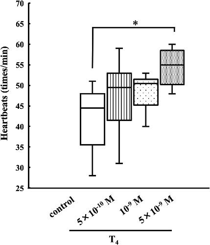 Fig. 2. Effect of T4 on st. 57 tadpoleheart. Box length indicates the interquartile range or IQR (25th to 75th percentile), and the horizontal line shows the median. The whiskers show distance 1.5 times IQR. This experiment was carried out using 6 hearts. *Significantly greater (P < 0.05) than the corresponding control value.
