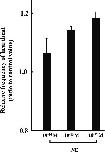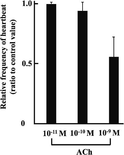 Fig. 3. ACh-decreased heartbeats frequency of organ-cultured st. 57 hearts. Each value was measured by number of heartbeats times per minute, and represented by ratio to the control value. Experiment was carried out using 4 hearts. Values given represent the mean value ± standard error.