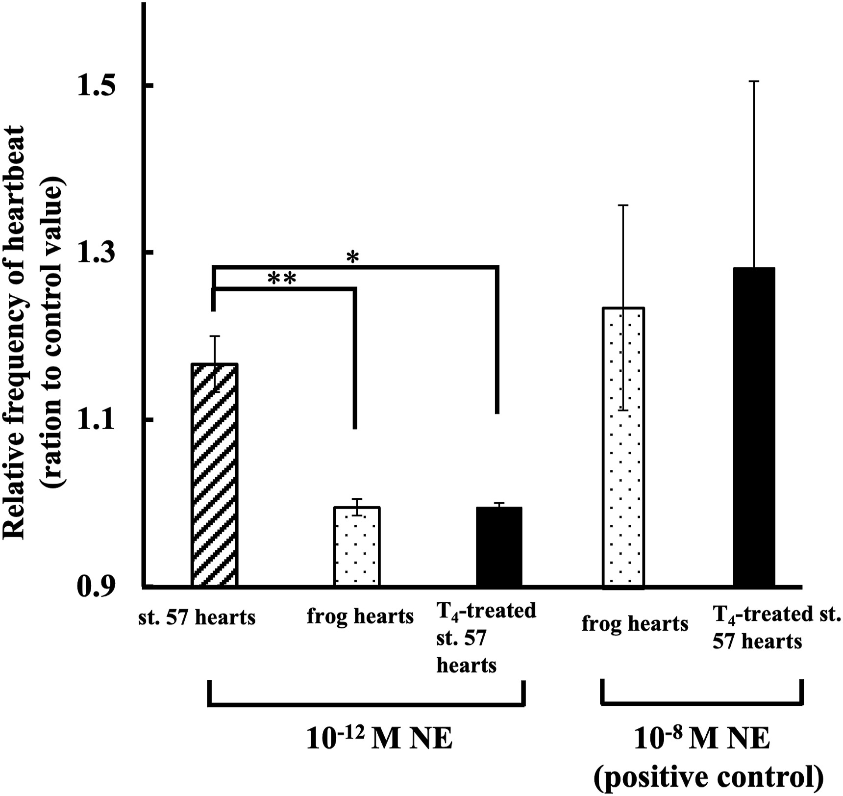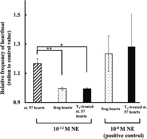 Fig. 6. Effect of NE on T4-treated st. 57- and 2–4 weeks frog-hearts after metamorphosis completion. Values given represent the mean value ± standard error. Each value was measured by number of heartbeats times per minute, and represented by ratio given to the control value. Experiment was carried out using 4 hearts. *Significantly less (P < 0.05) than the corresponding values for the ratio given to the value from st. 57 hearts. *Significantly less (P < 0.05) than the corresponding values for the ratio given to the value from st. 57 hearts (control). **Significantly less (P < 0.01) than the corresponding values for the ratio given to the value from st. 57 hearts (control).