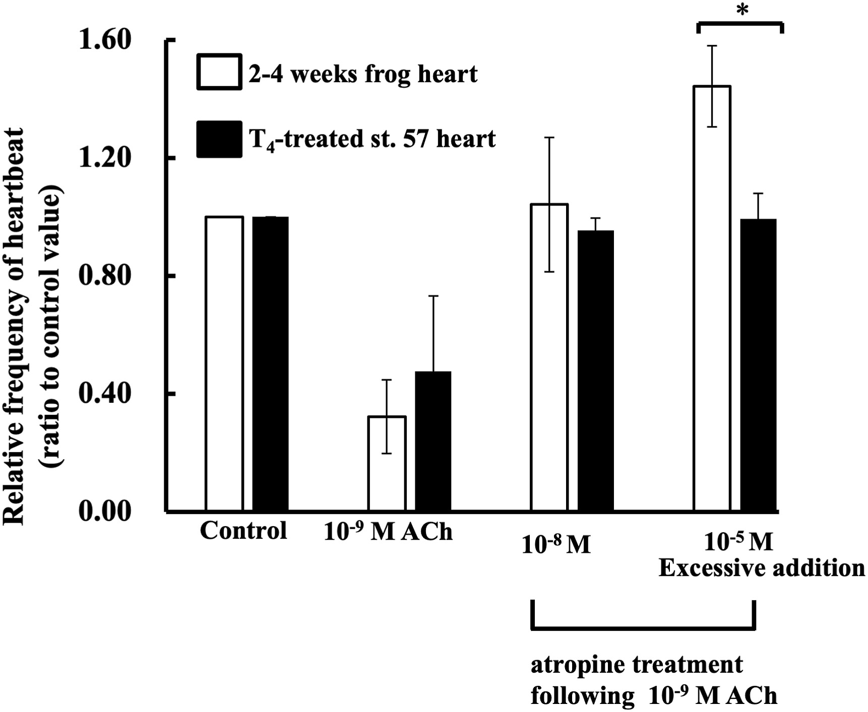 Fig. 4. Effects of ACh and atropine on T4-treated tadpole- and 2–4 weeks frog-hearts. This experiment was carried out using four hearts. Values given represent the mean value ± standard error. Atropine treatments were carried out at 2 min (10−8 M atropine) and 4 min (10−5 M atropine) after ACh treatment. Each value was measured by number of heartbeats times per minute, and represented by ratio given to the control value. Experiment was carried out using 4 hearts. *Significantly less (P < 0.05) than the corresponding value for the rate for the frog heartbeats.